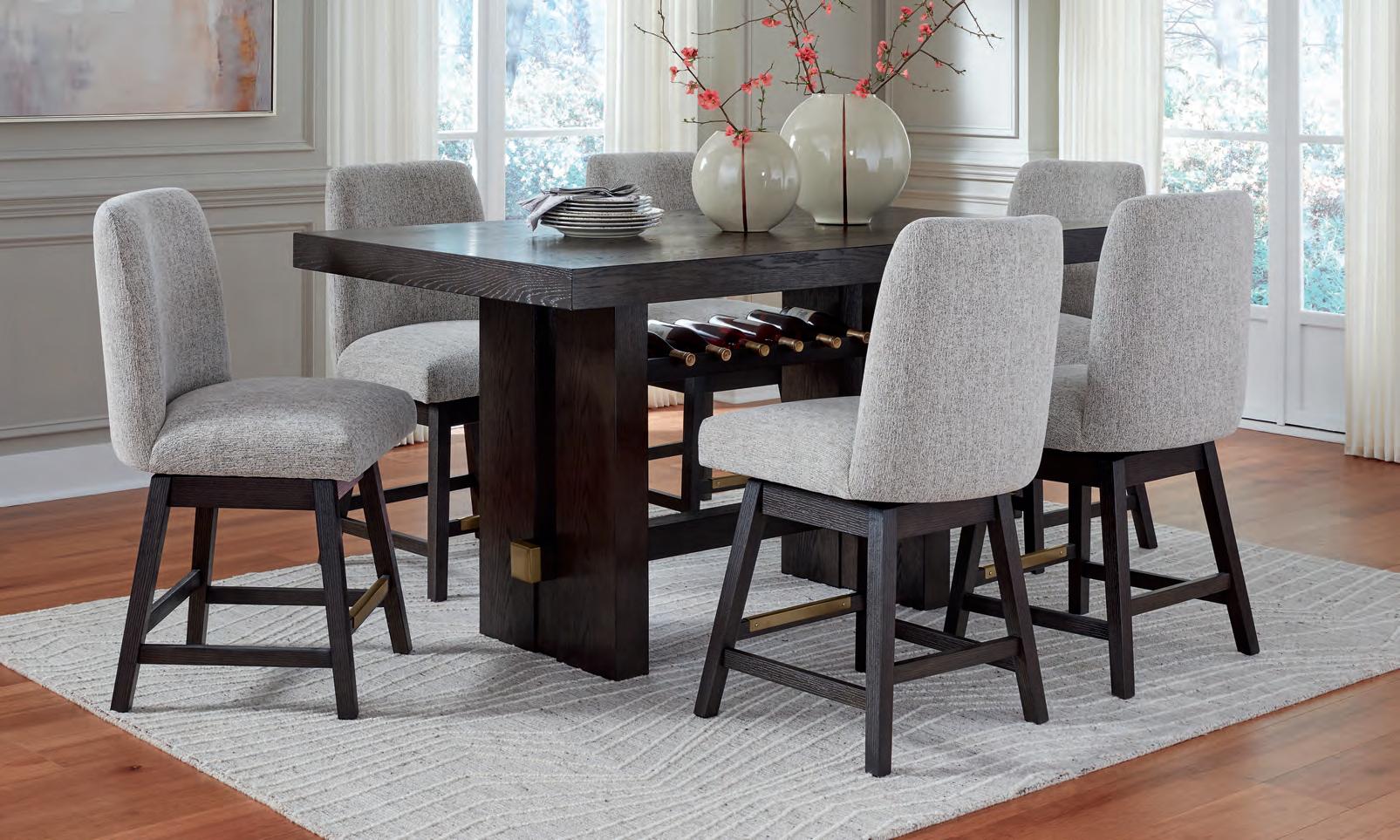 The Rectangular Counter Table features a thick edge table top and stylish double pedestal base along with an integrated wine rack