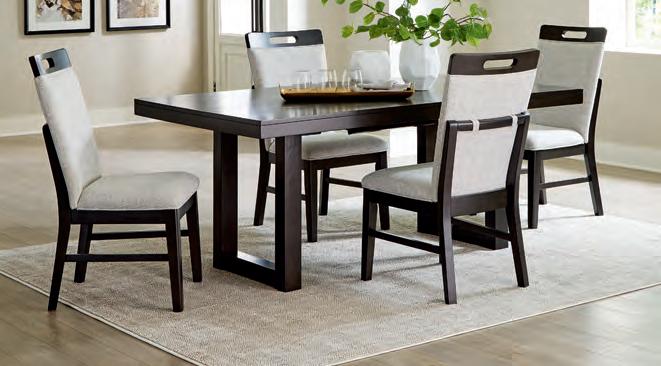 With the rich black finished legs supporting the gray tones of the polyurethane coated print marble table top, the sleek contemporary design of the “Maysville” dining collection creates comfortable dining with the stylish look of the black faux leather button-tufted upholstered seating.