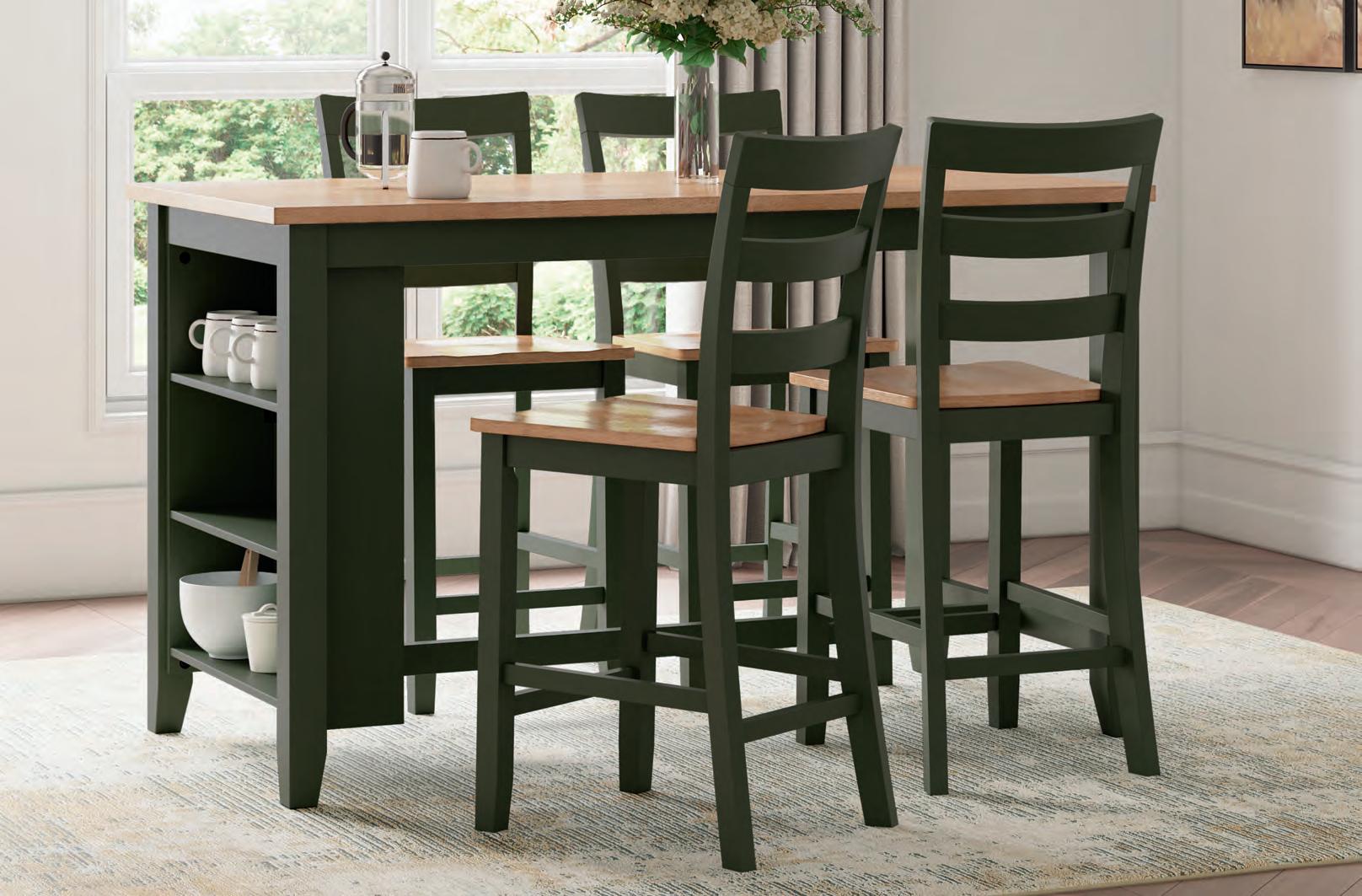 The Rectangular Counter Height Dining Table sits on a stylish Double Trestle base with a thick solid wood framed top that seats up to 6