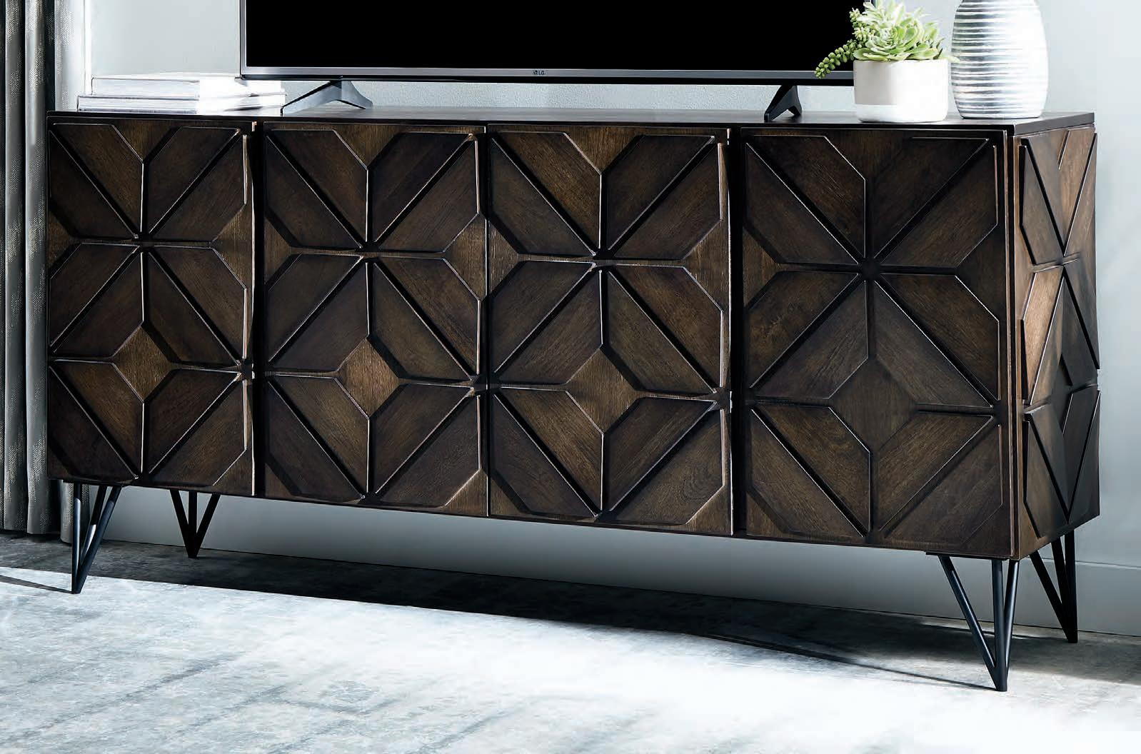 This large TV stand features two cabinets with four doors with framed chevron accents along with an adjustable shelf in each