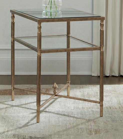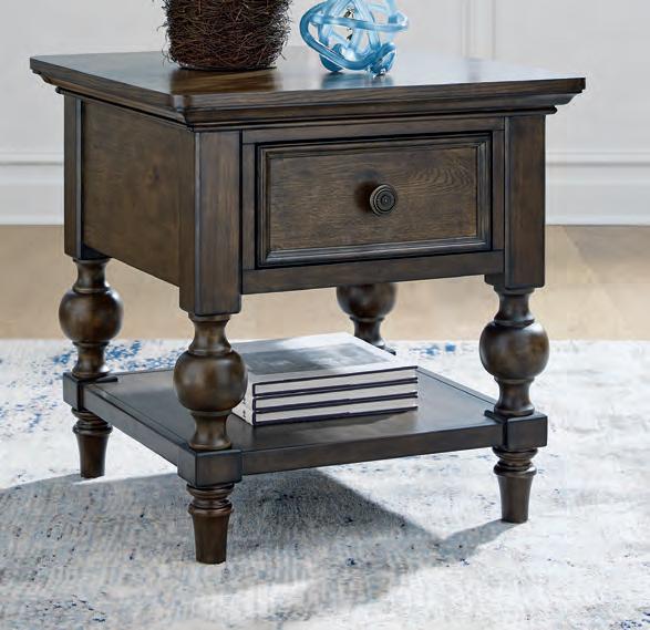 The End Table features a unique open shelf design with drawer storage featuring bar pull hardware with polished pewter-tone finish