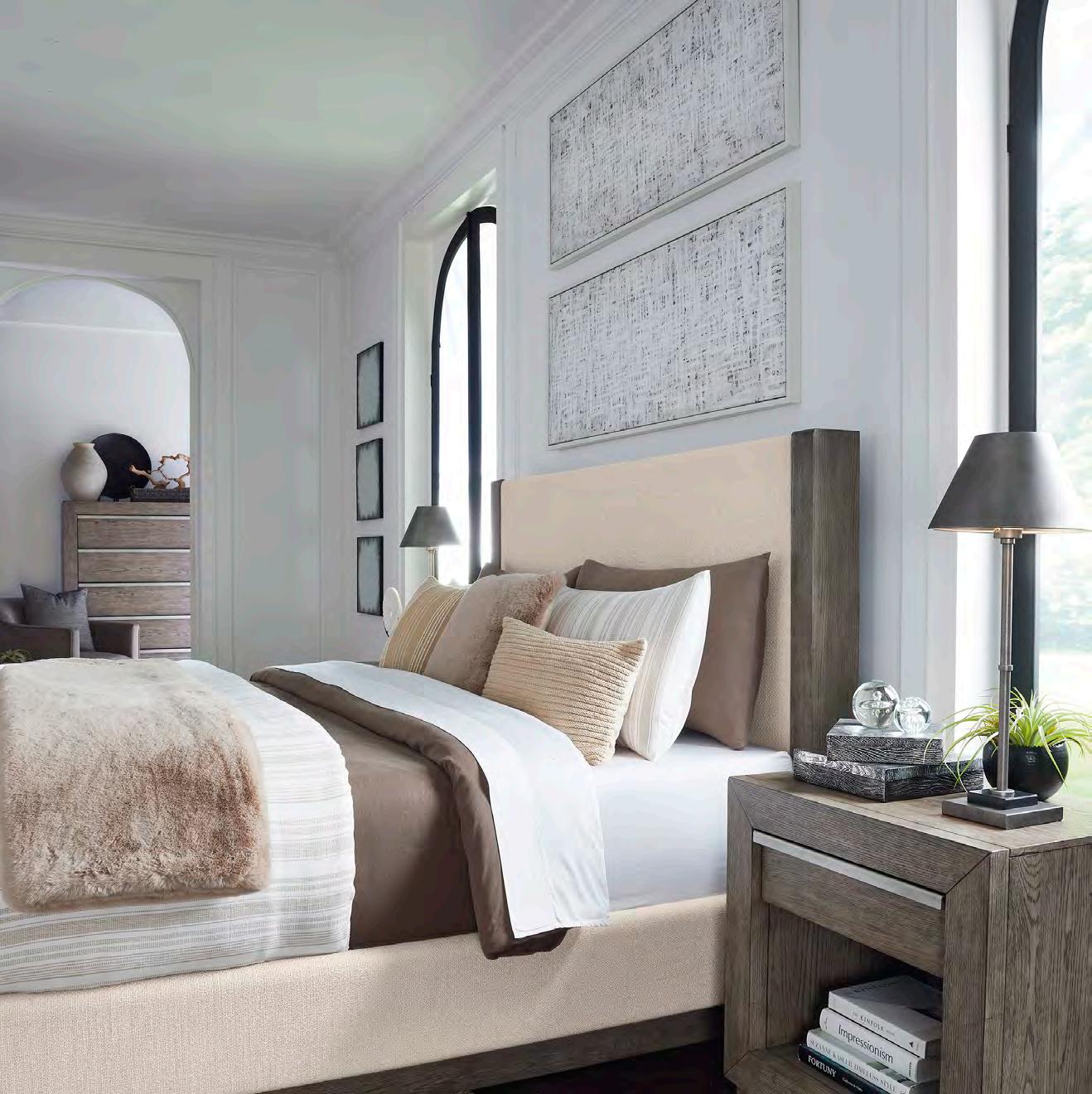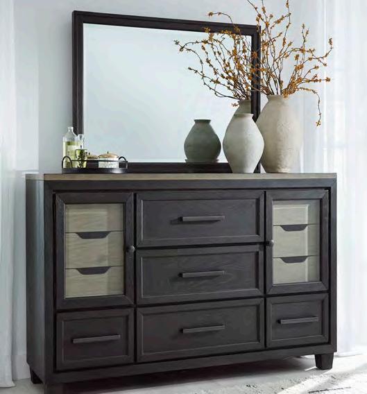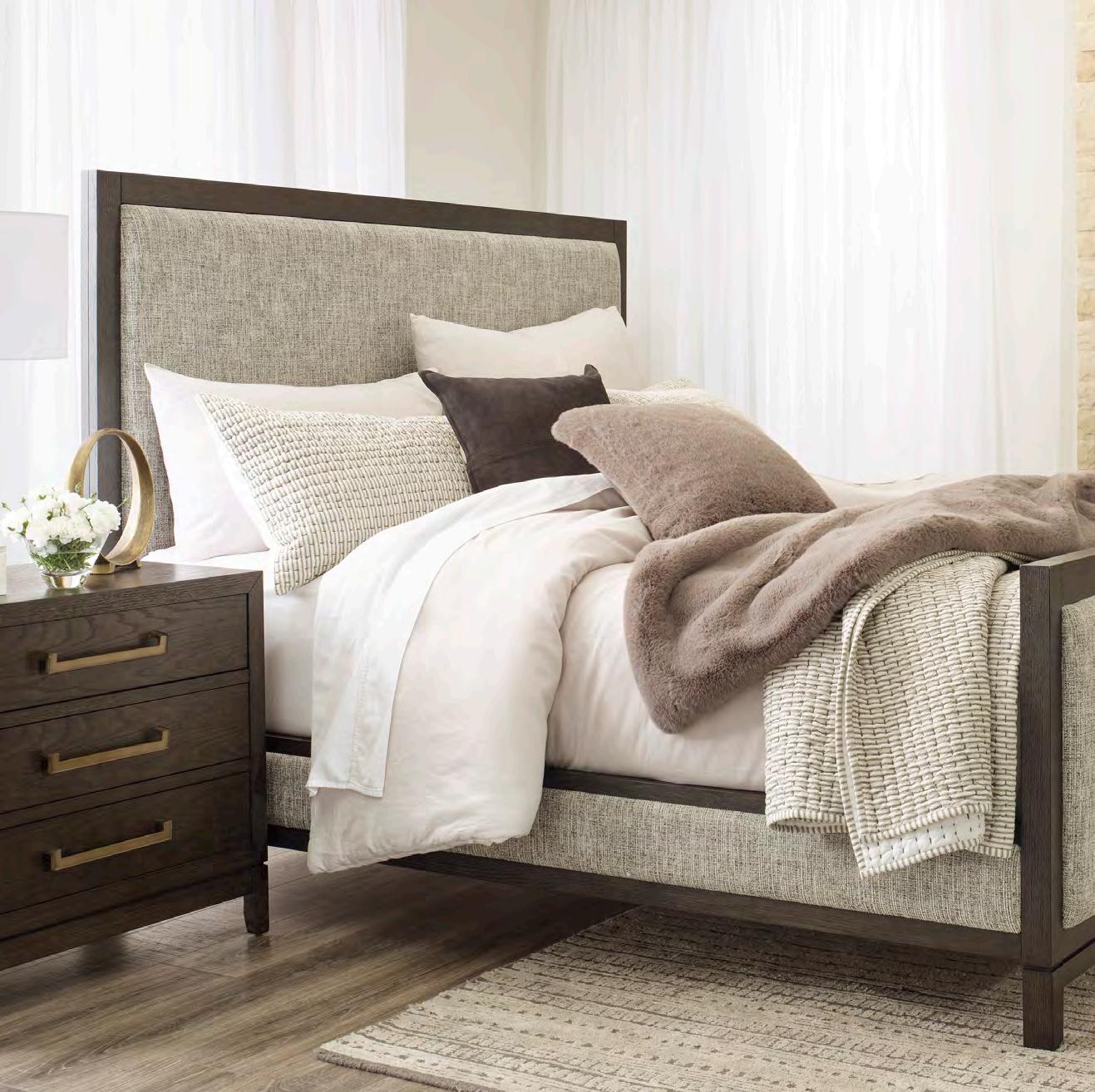 bar pulls look sleek against the hand-rubbed weathered gray finish. Picture frame details and the handsomely upholstered bed’s floating silhouette elevate this group’s modern flair.