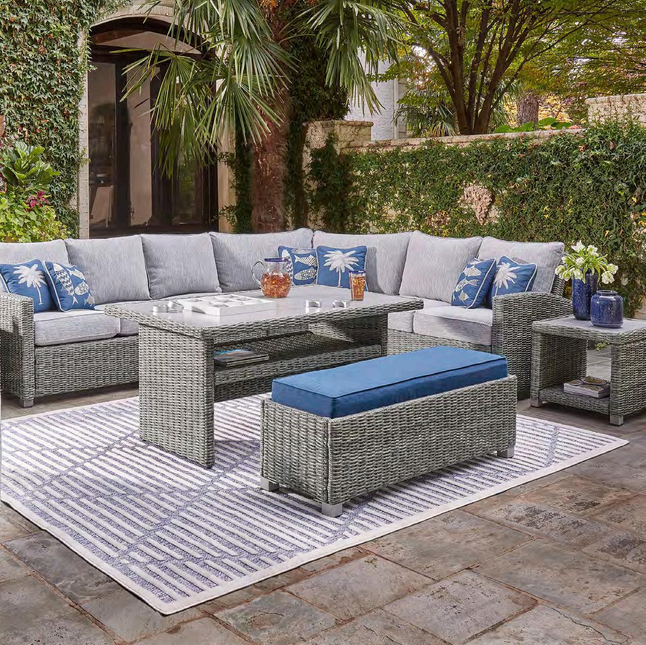 Redefine your outdoor retreat when you add the simply stunning Citrine Park sectional and ottoman to your patio, porch or poolside. Dark neutral cushions wrapped in highperformance Nuvella® Premium fabric harmonize with the eucalyptus wood frame. Revel in a richly relaxed sense of style while making memories with family and friends or lounging on your own.