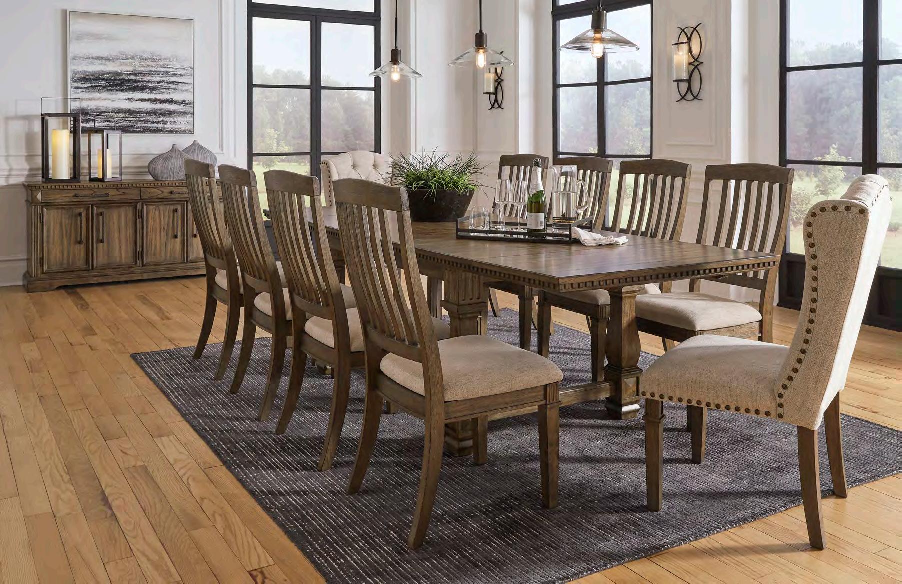 Curate a vintage-inspired retreat from the modern world without setting foot in an open-air market. The Markenburg dining collection is draped in a complex stain and glaze finish amidst traditional styling. Profiled moldings, fluted pilasters and inset dentil trim on the extension table and server elevate your dining experience. Smartly upholstered slat-back and stylized wingback chairs deliver picturesque finishing touches.