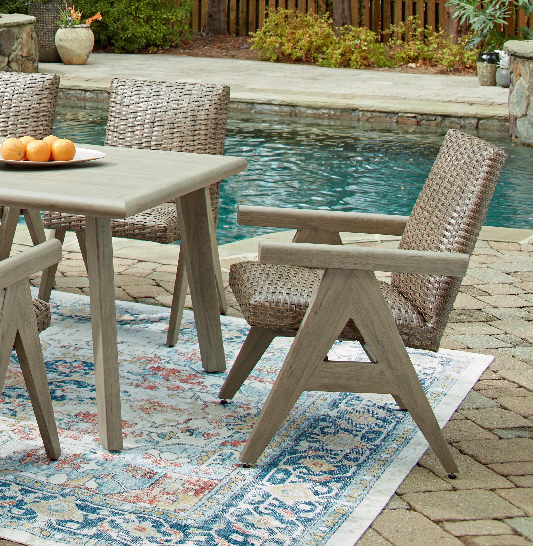 A. Swivel Rocker Dining Chair P701-602A. 25” W x 28” D x 39” H. Ships 2 per carton. B. Dining Arm Chair P701-601A. 25” W x 26” D x 39” H. Ships 2 per carton. C. Rectangular Dining Table with Umbrella Hole P701-625. 84” W x 42” D x 30” H. Ships 1 per carton. D. Marenda Vase Set A2000130. Ships set of 2 per carton. E. Daddridge Rug R900101. Various sizes available. Ships 1 per carton.
