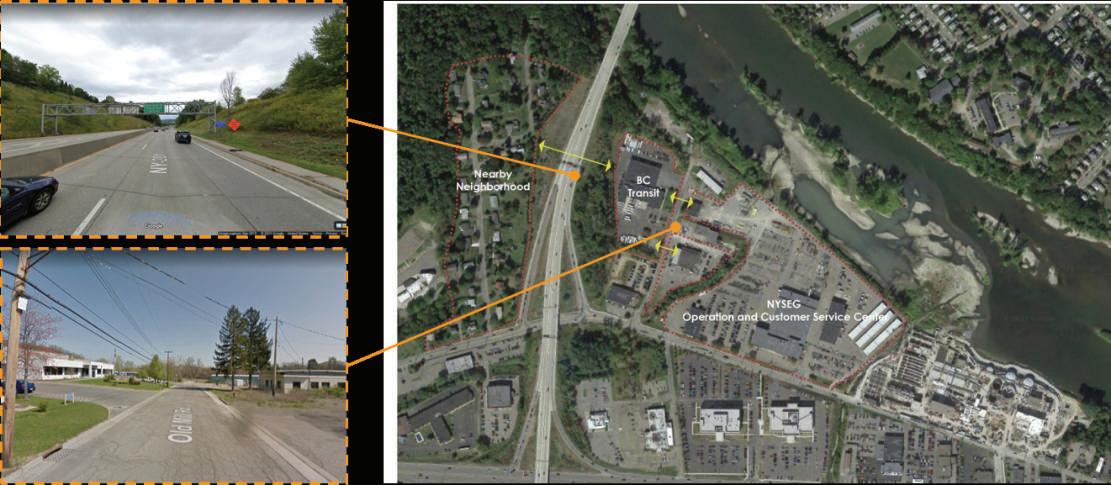 The site is located at the BC Transit Headquarters at 413 Old Mill Rd. Vestal, NY 13850. Old Mill Rd. is a short, dead end street off of Vestal Rd. near the on ramp to CFJ Memorial Highway/NY 201. Lined with industrial and commercial uses, the road dead ends just short of the southern bank of the Susquehanna River, though it continues as a dirt and gravel road on private property along the riverbank.