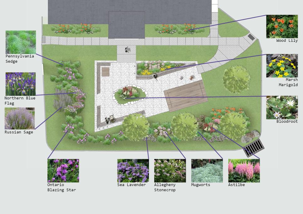 Plantings of the selected species can now begin, assuming it is the correct season. Ensure the rain garden depressions are filled with the sand, compost, and soil mixture until they are approximately 4-6 inches deep. Then plant with seeds at 1.5 feet on center, based on the provided planting map or in consultation with a landscaping professional. Above this, place 2 inches of shredded mulch and water weekly or as needed depending on natural seasonal rainfall. Since these are native or water-hardy plants, maintenance requirements are limited to occasional weeding and trimming as needed. In the spring, dead plant residue should be removed as needed.