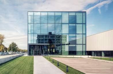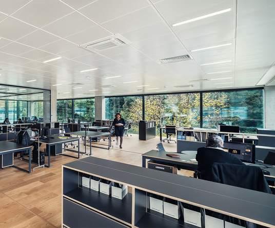 There are only a few materials used in the project's architectural language: glass, exposed concrete, aluminium, and wood. Only the dark L-shaped aluminium canopy at the entry breaks up the clean glass prism of the building's facade, which is strictly geometric and austere. The large-format triple glazing glass panels offer a smooth transition between inside and exterior space and permit unrestricted views of the surroundings. The inside of the building contrasts the building's basic façade with the abundant space of the atrium and the dynamic volumes of the balconies. Concrete is visible in the structural beams, columns, and the elevator's vertical core. The atrium is visually warmed by natural wood panelling, followed by the atrium, the relaxation areas, and the balconies are all covered in natural vegetation, which is the fifth "material."