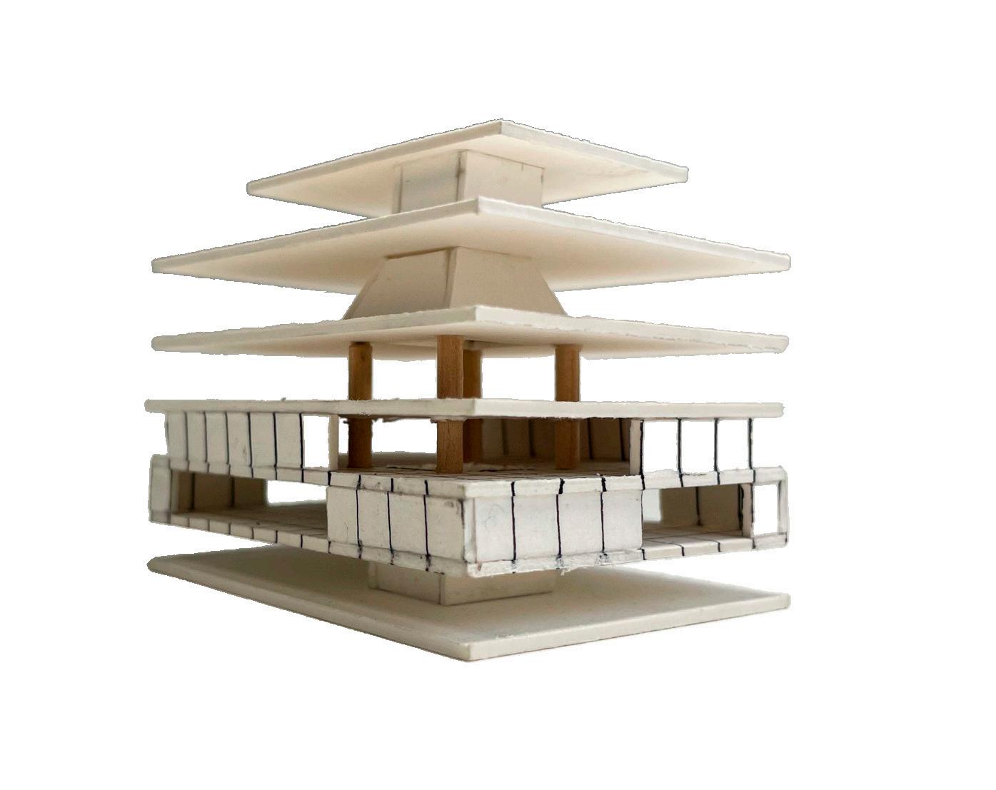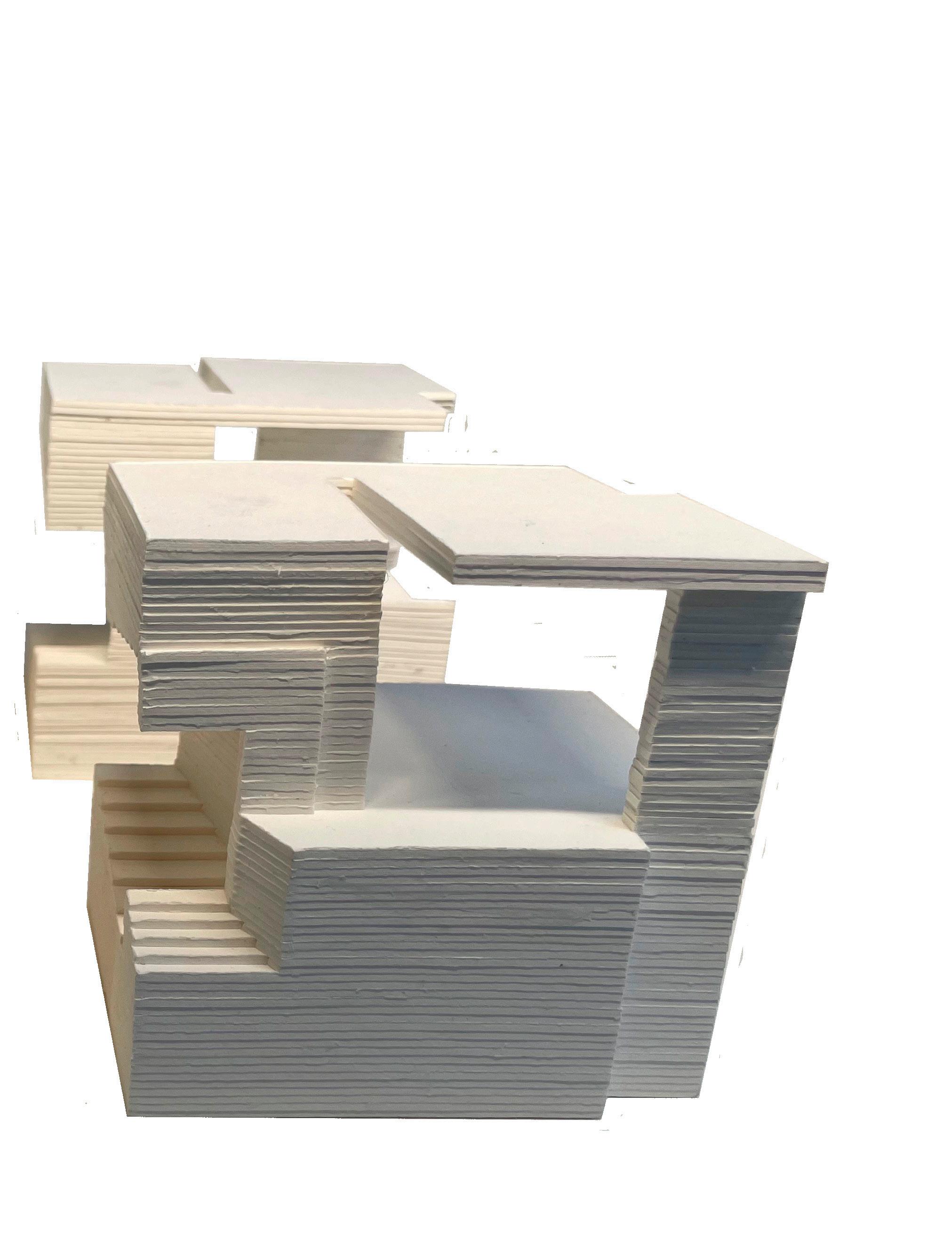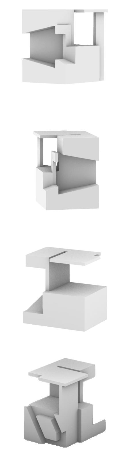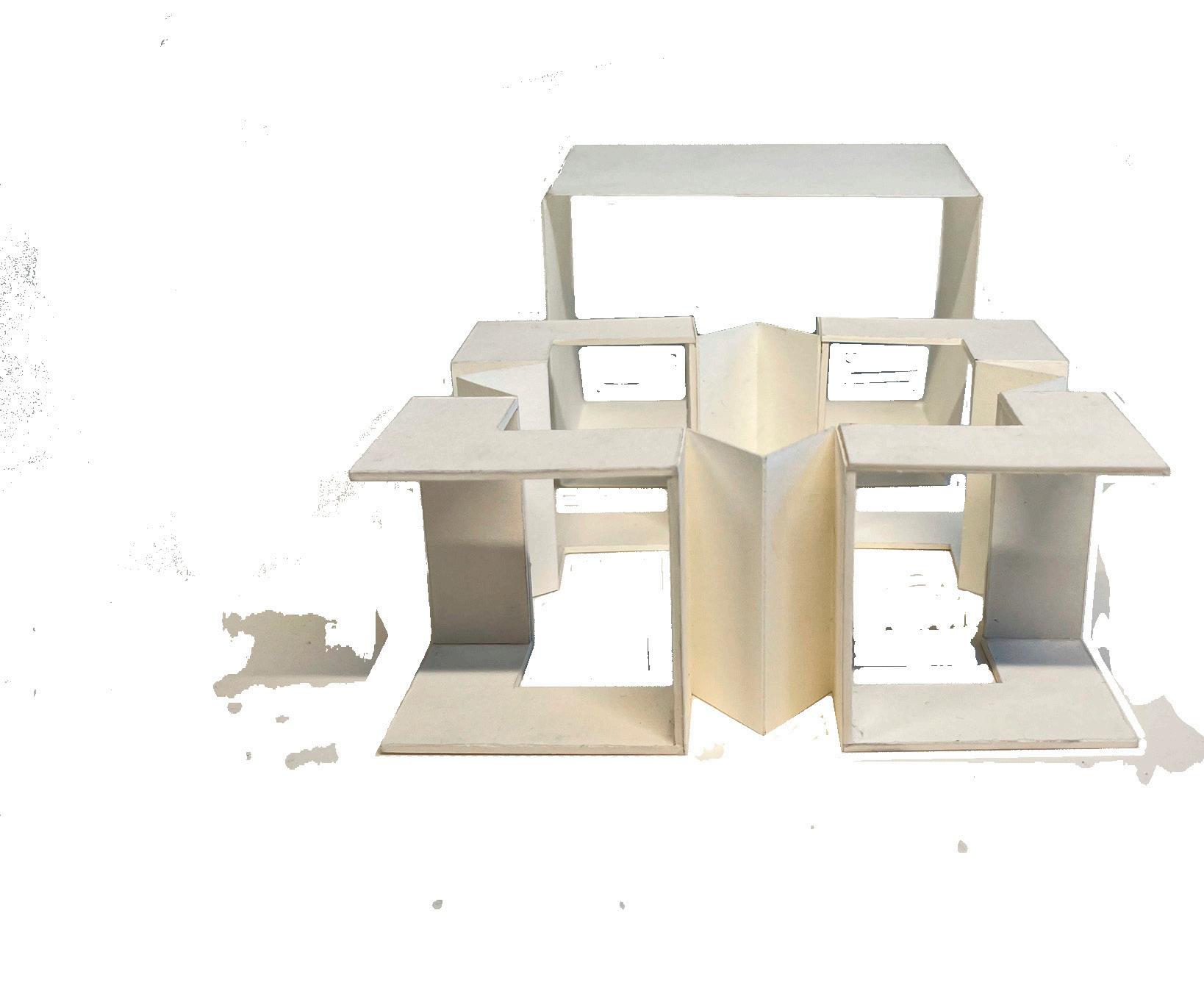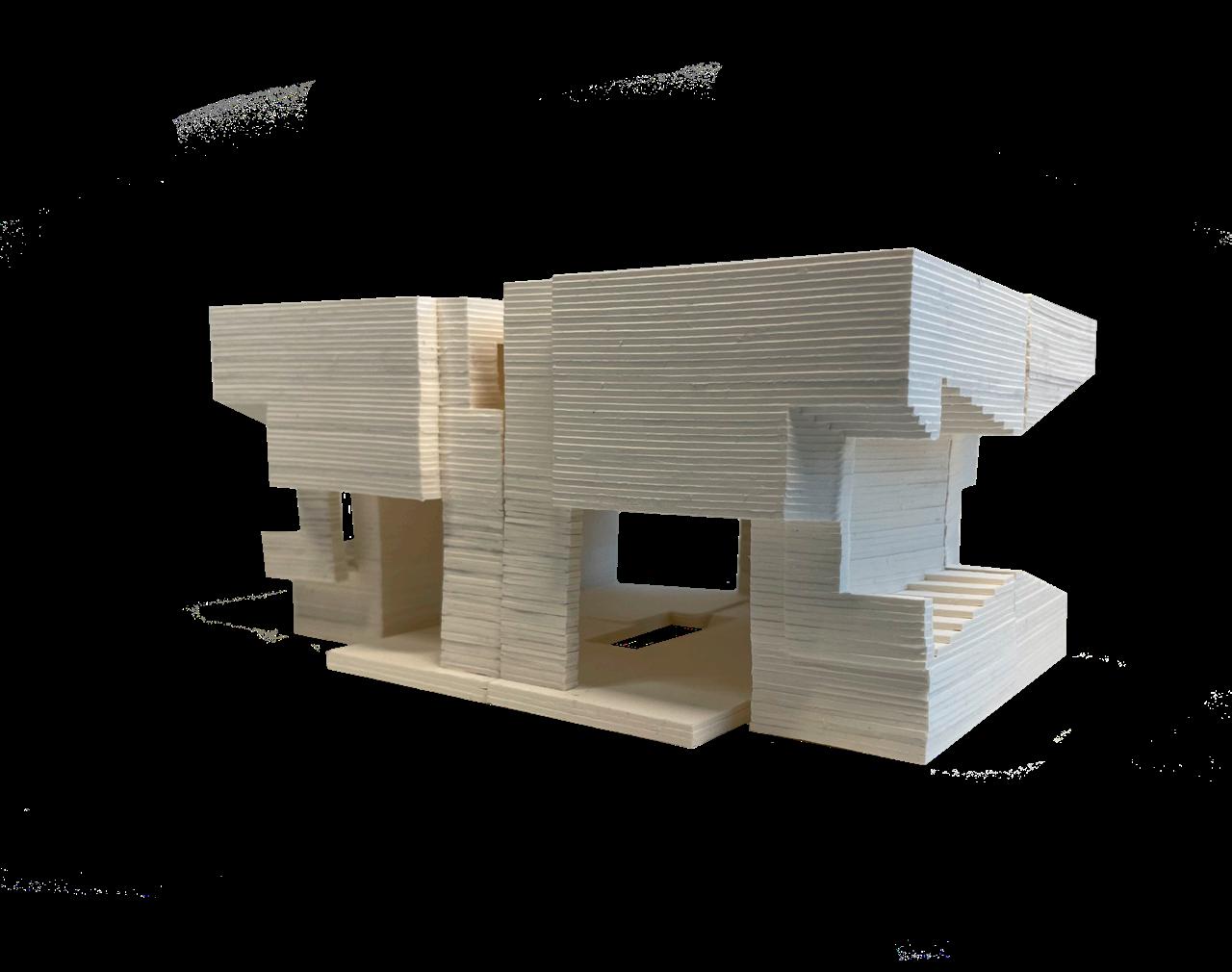 This final model is made up of four distinct pieces. The dimension of each piece is 4”x2”x3”. Each piece contains similar qualities with every other piece without being a replica of another piece. Due to the modularity of The Orinda House, the pieces can move freely from one organization to another. There is no correct way to organize the pieces instead it is up to the user to determine the relationship that will be represented through the organization. In the same way no piece has one defined purpose/ program, its program is determined by the organization of all the pieces as a whole.