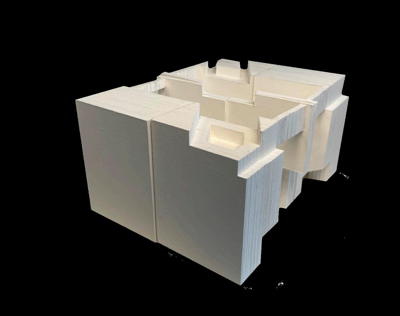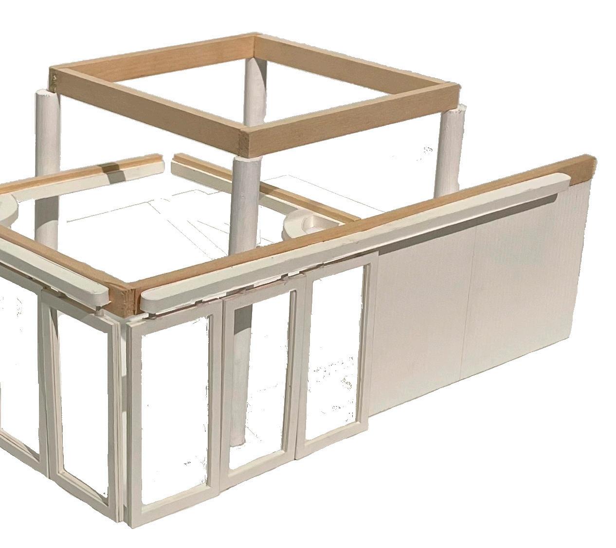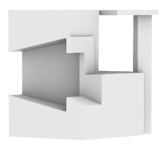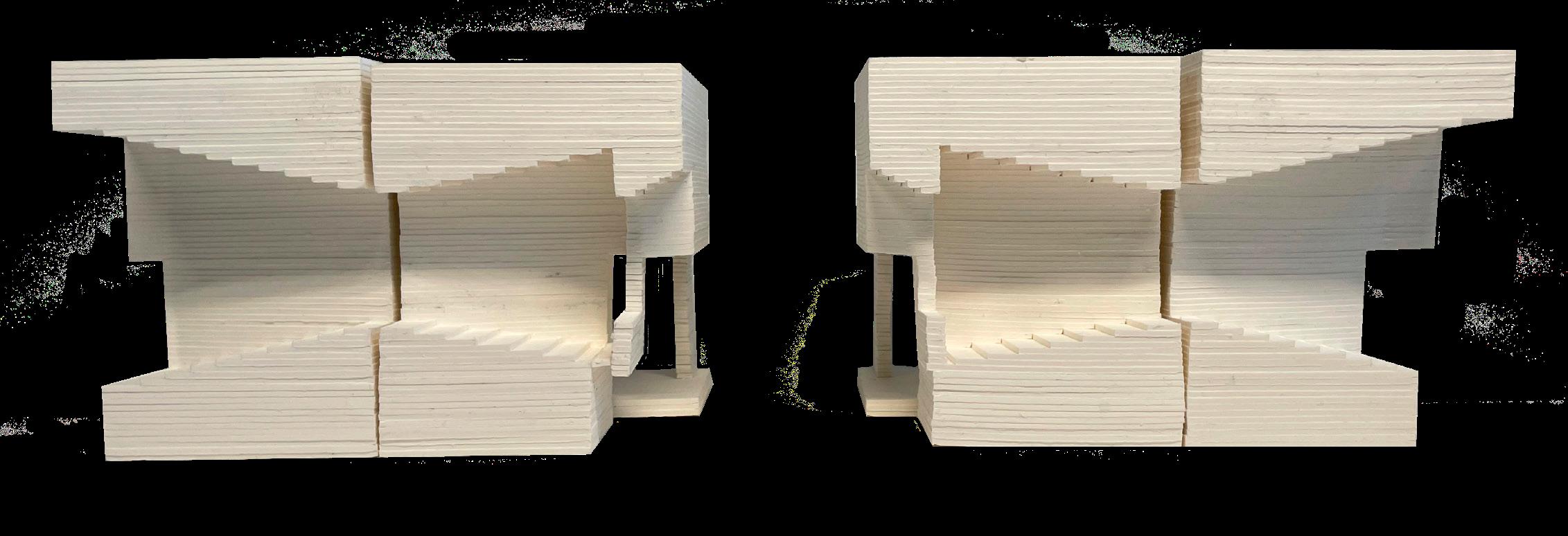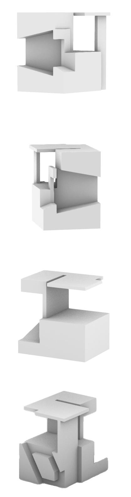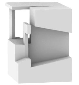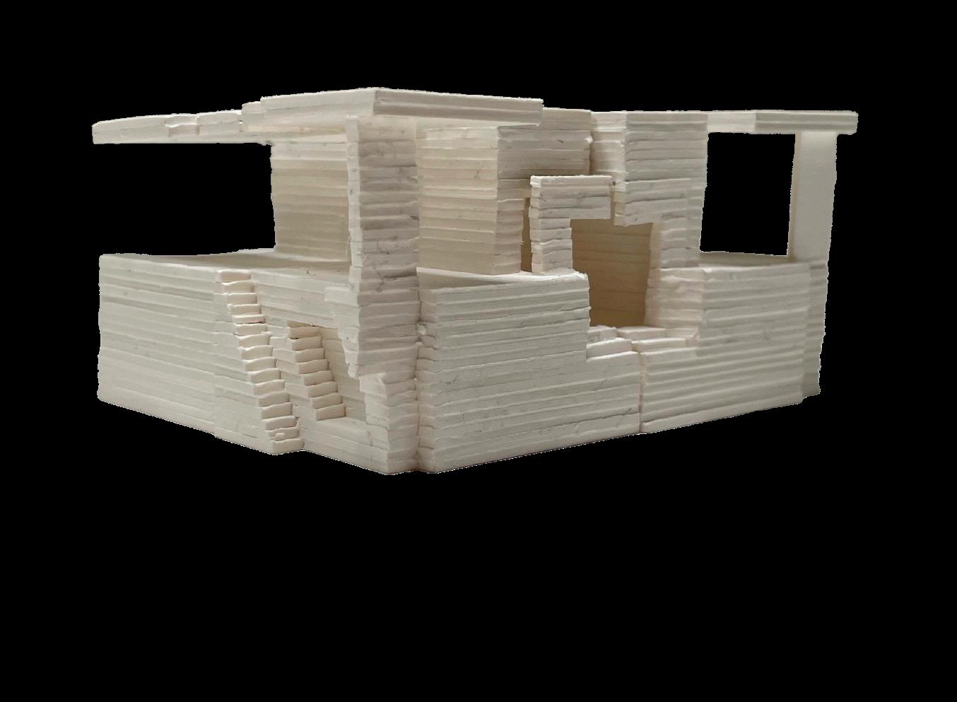 This final model is made up of four distinct pieces. The dimension of each piece is 4”x2”x3”. Each piece contains similar qualities with every other piece without being a replica of another piece. Due to the modularity of The Orinda House, the pieces can move freely from one organization to another. There is no correct way to organize the pieces instead it is up to the user to determine the relationship that will be represented through the organization. In the same way no piece has one defined purpose/ program, its program is determined by the organization of all the pieces as a whole.