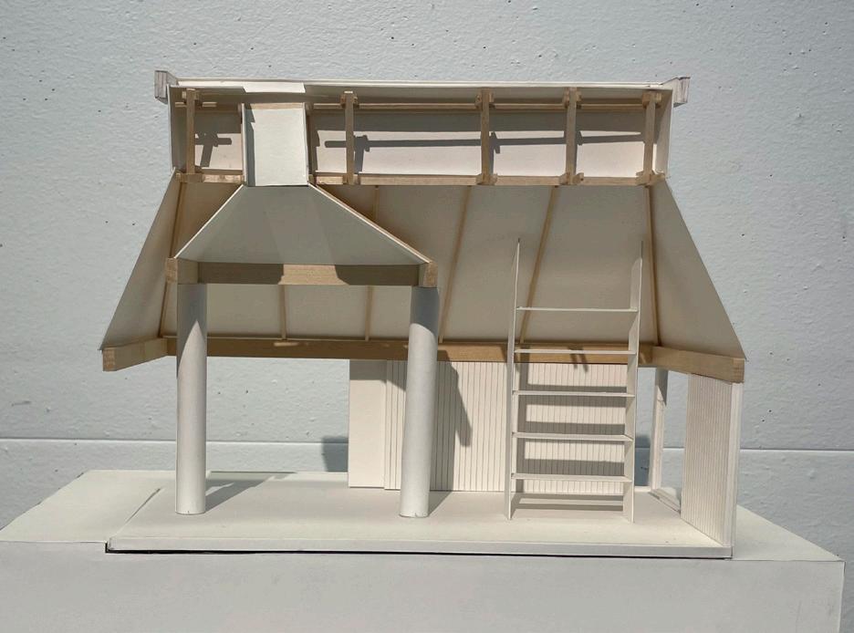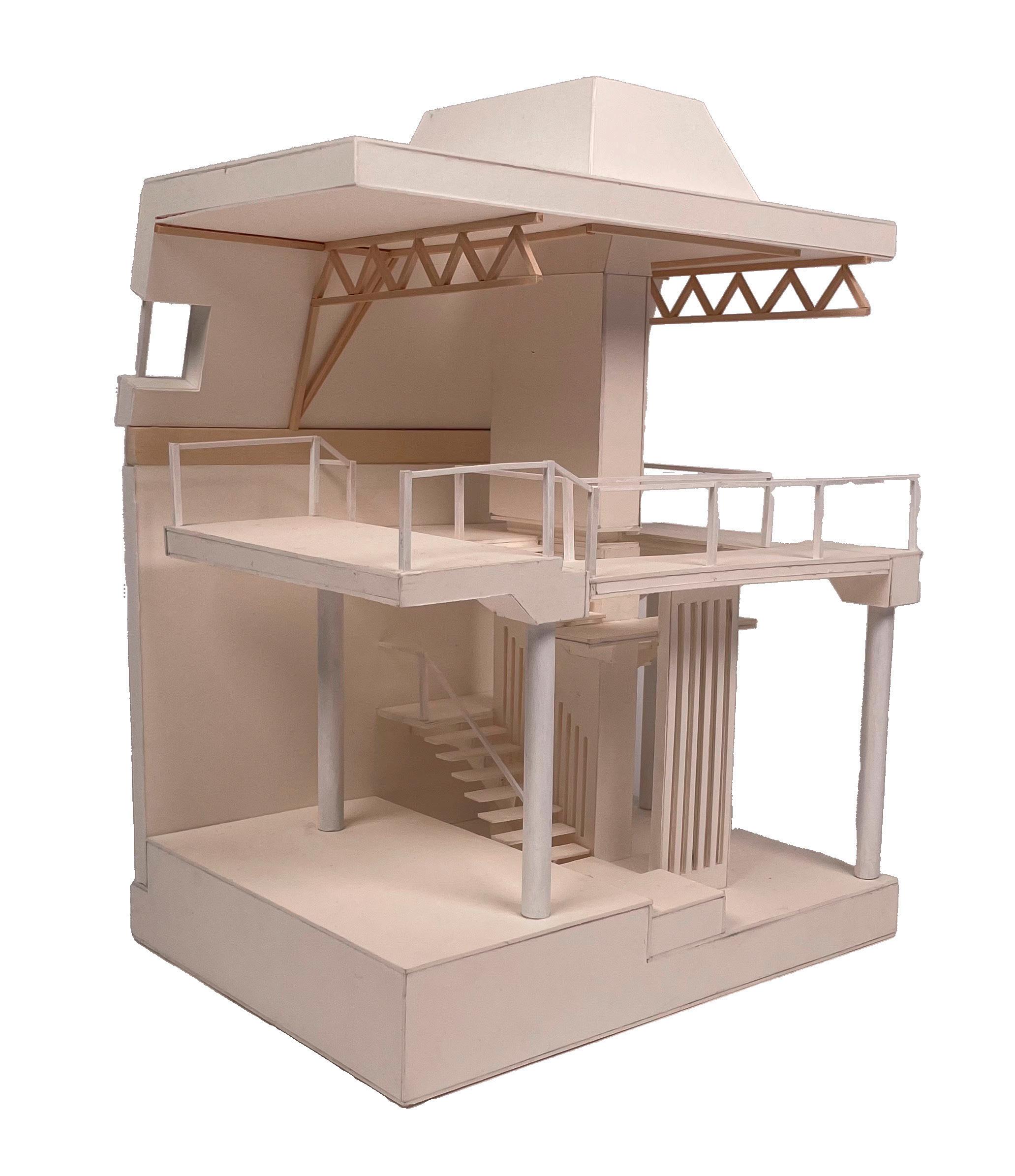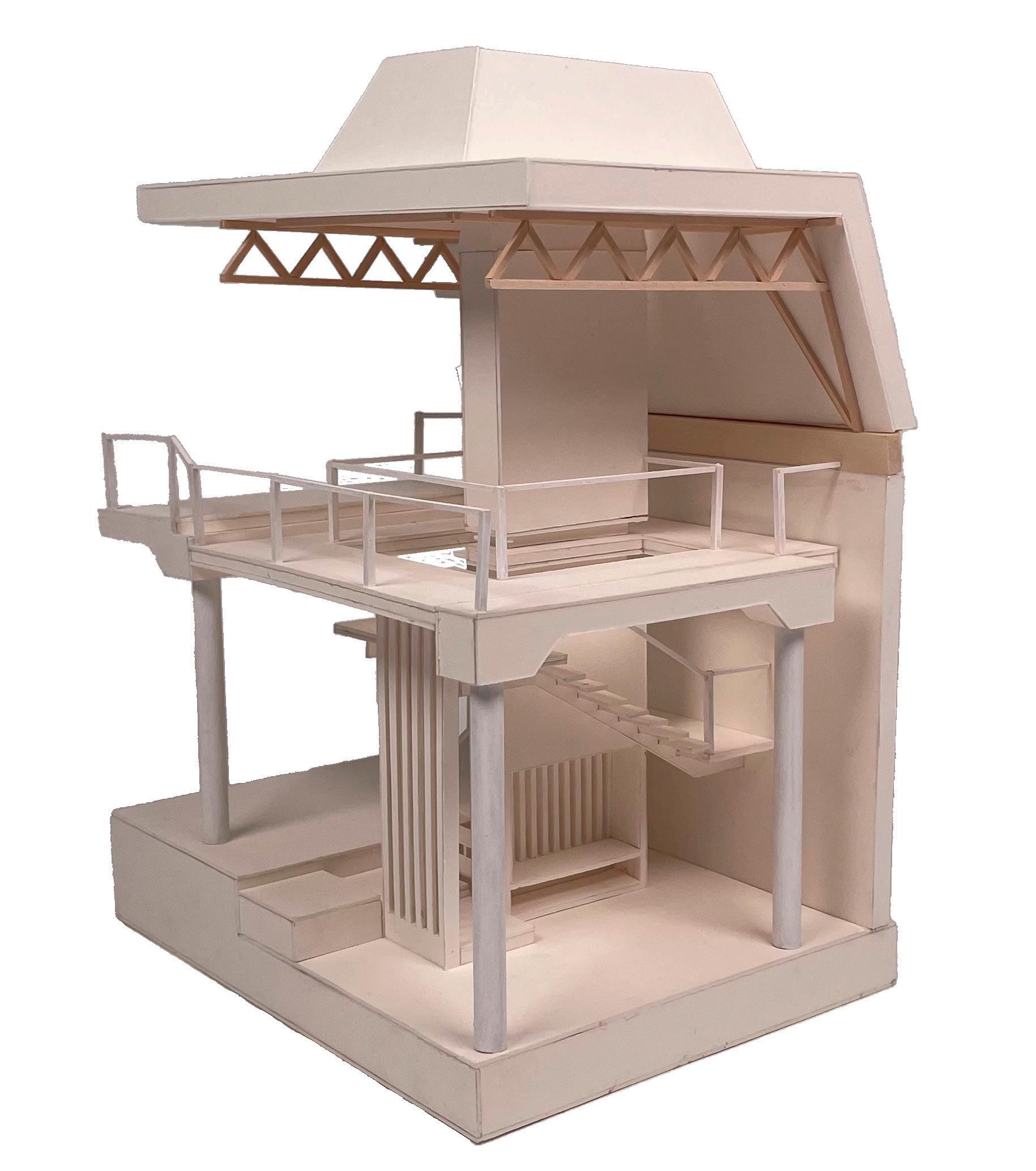 Inspired by the design of its precedent, The Orinda House, The Inrado Platform House is a project that further investigates the presence of separate spaces without the implementation of four walls, a ceiling, and floor. Due to its lack of walls, it plays with sight lines to create a sense of privacy. The use of light to frame spaces is also prevalent through the skylights in the roof.