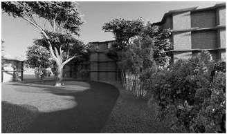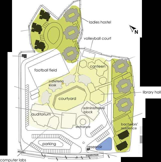 The complex includes academic and residential spaces for staff and students. All blocks are accessed by covered pathways. Seating and recreational spaces are provided at the intersection of these nodes