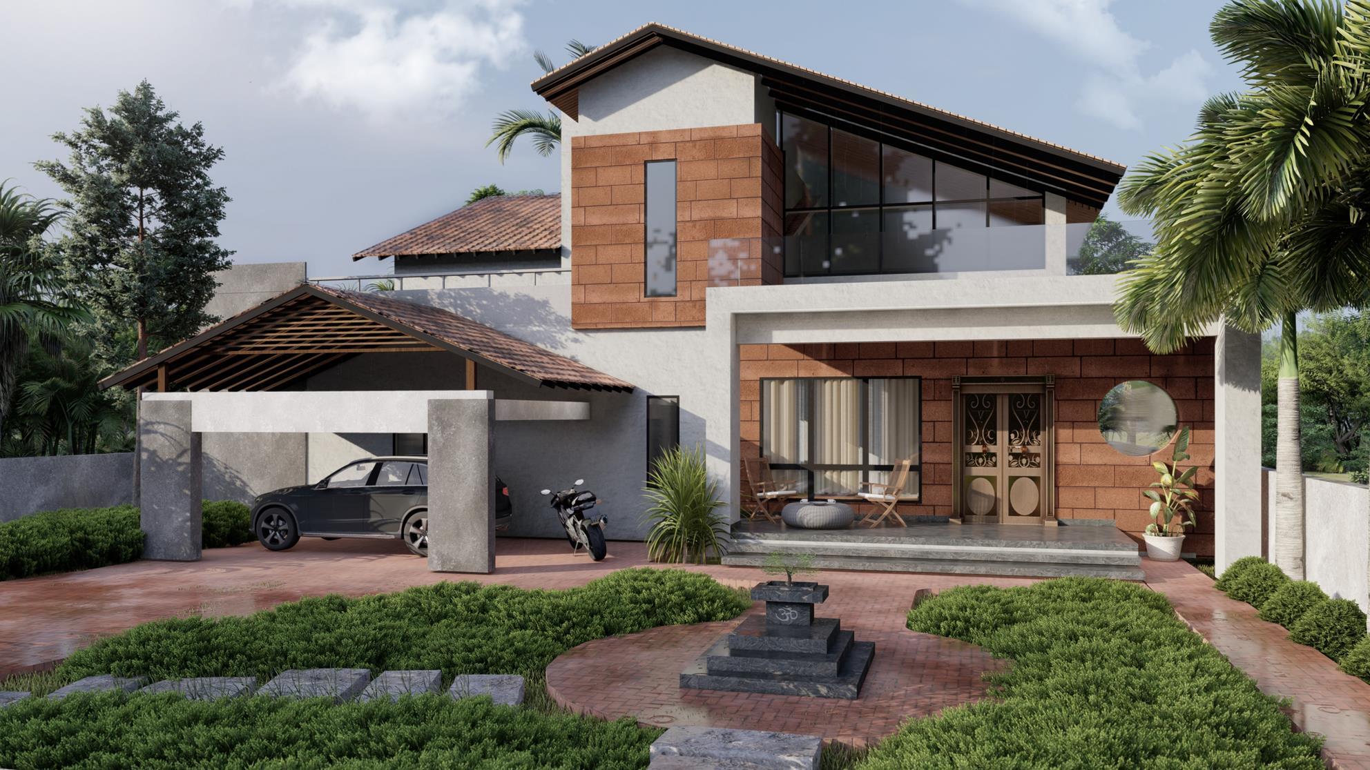 THIS RESIDENTIAL PROJECT IN UDUPI, KARNATAKA, FEATURES A FACADE THAT SEAMLESSLY BLENDS TRADITIONAL AND MODERN DESIGN ELEMENTS. THE USE OF LATERITE