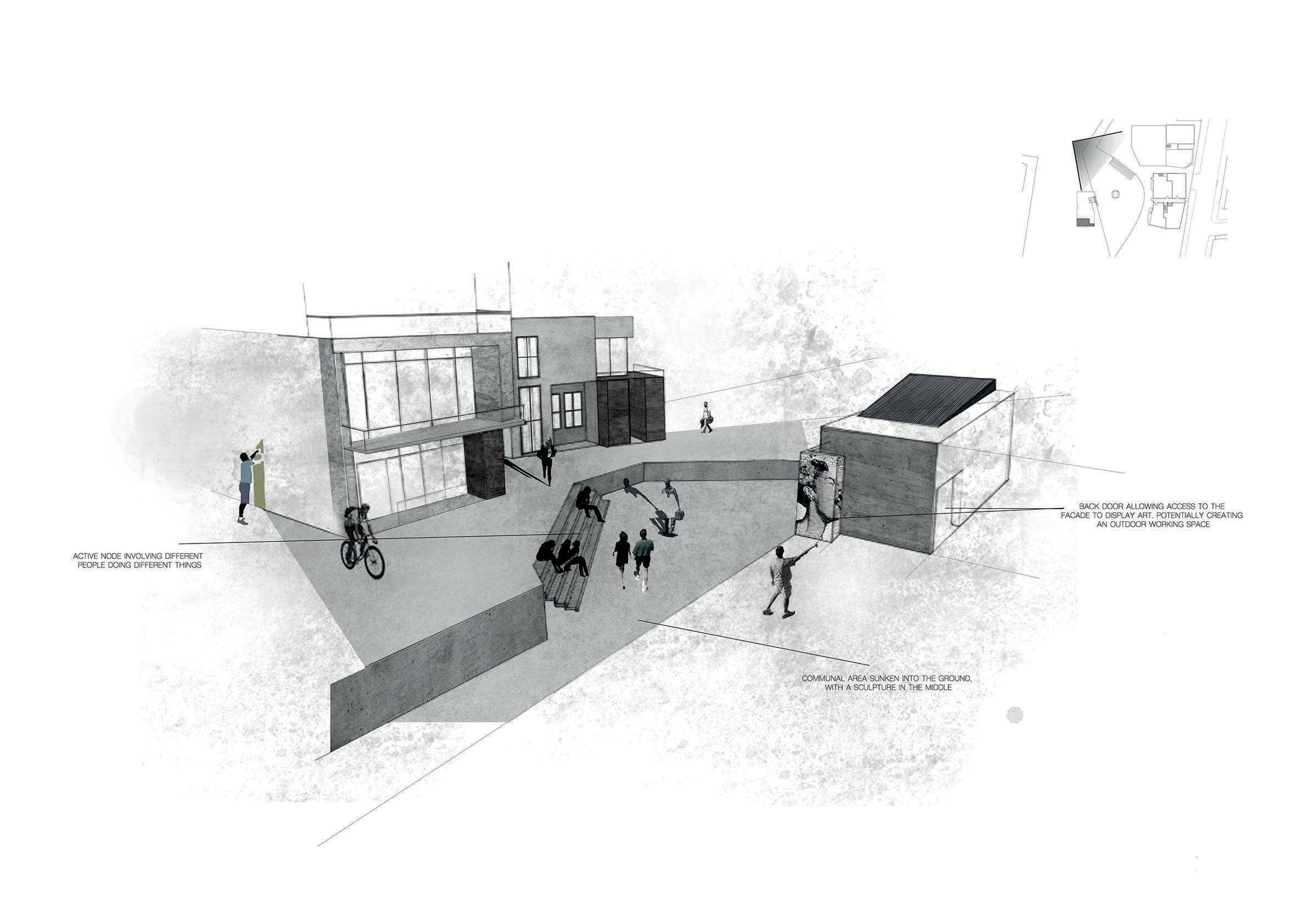 The proposed program consists of a Hotel, residential housing and various art work-shops, situated within a sculpture park. The project provides an opportunity for residents and visitors of the project to engage with an artistic activity.