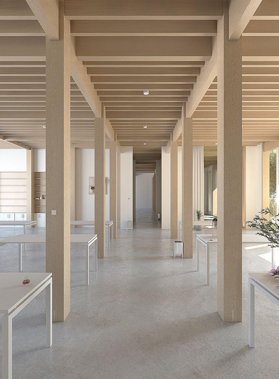 This building is comprised of two main programs - the educational spaces, and the industrial spaces. The industrial spaces are on the ground floor (below) and are for the processing and distribution of flowers from the neighboring flower farm. The educational spaces are on the upper floors which contain classrooms, workshops, terraces, and a café.