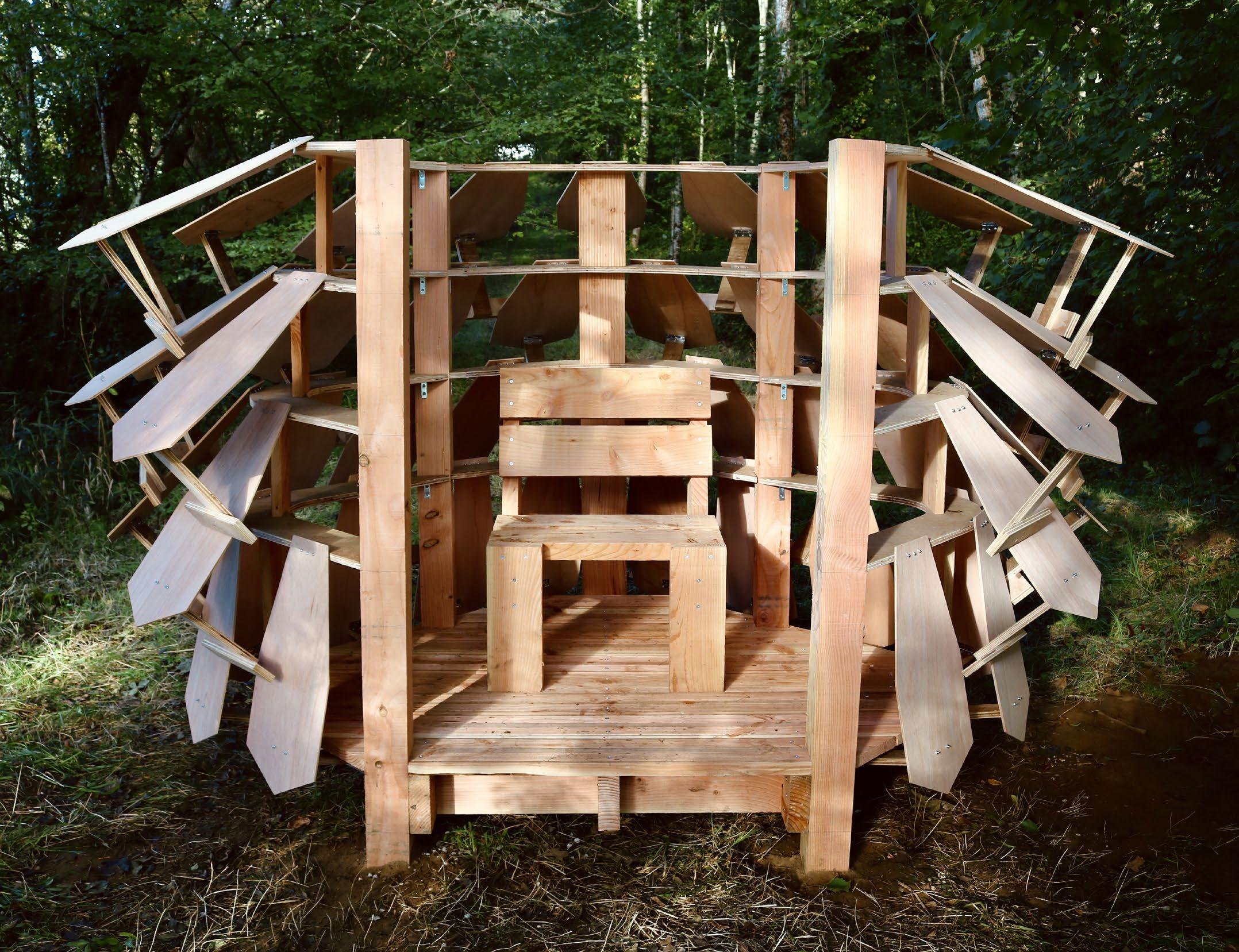 Positioned due east before the Vienne River in Lessac, France, its scaled facade can be manually adjusted with hinges and props to control light, wind, and privacy conditions. Inside, a single chair offers a solitary occupant an unobstructed view of the river and surrounding trees, offering a serene and immersive connection with nature.