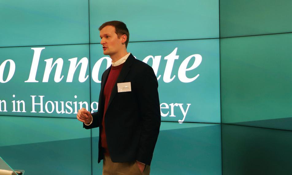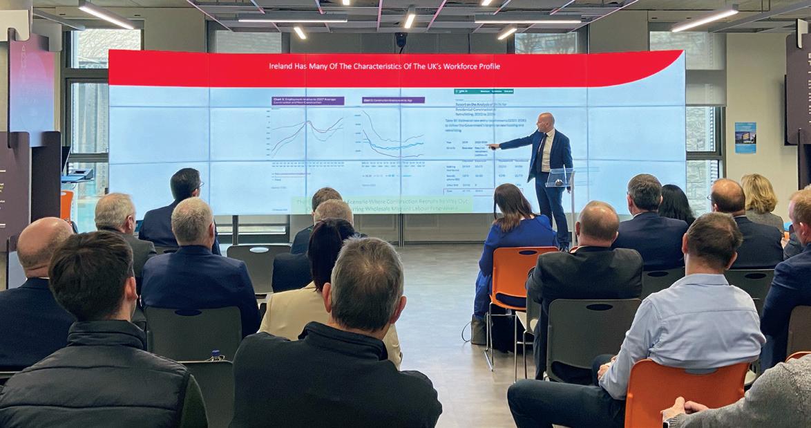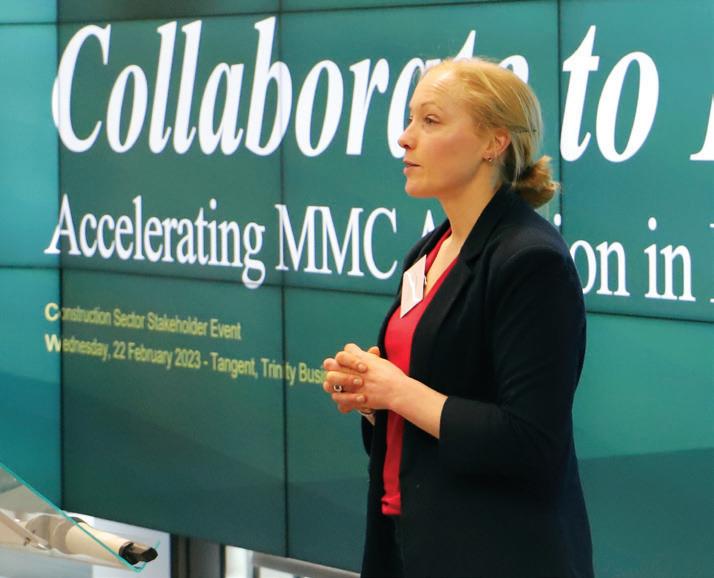 ABOVE LEFT: Sarah Miley from the Department of Further and Higher Education, Research, Innovation and Science, provided an update on progress to develop a National Demonstration Park for Modern Methods of Construction, hosted by LOETB in Mount Lucas, Offaly. ABOVE RIGHT: Tom Maguire outlined the business supports available under Enterprise Ireland’s Built to Innovate programme..