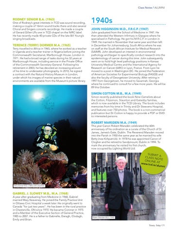 rodney Senior B.a. (1963) One of Rodney’s great interests in TCD was sound recording, making a couple of 16mm sound tracks there and also several Choral and Singers concerts recordings. He made a couple of Gerard Gillen LPs one in TCD chapel on the NIRC label. He has recently made 40 private CDs of the late Bill Young’s singing broadcasts.