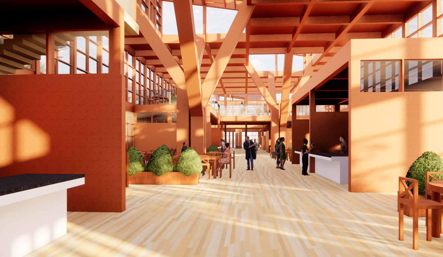 Image showing the central circulation space which serves as the nexus connecting all three blocks, from which alleyways diverge, seamlessly directing the flow of traffic into the building.