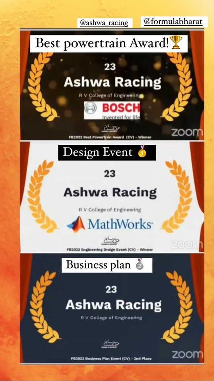 Team'svirtualpresence atEHW20211stEdition AshwaHyperloopTeam atEHW20222ndEditionAshwa bags 3 awards marking yet another milestone at the Formula Student India Event 2022, Coimbatore, Tamil Nadu after the Formula Hybrid’svictory.The3awardsforthecombustion prototype (RZ-XX2C) - Best Powertrain Award, First Place at Engineering Design Event, Runnerup at Business plan event have played a crucial role for the team to prepare for the upcoming eventsheldacrosstheworld