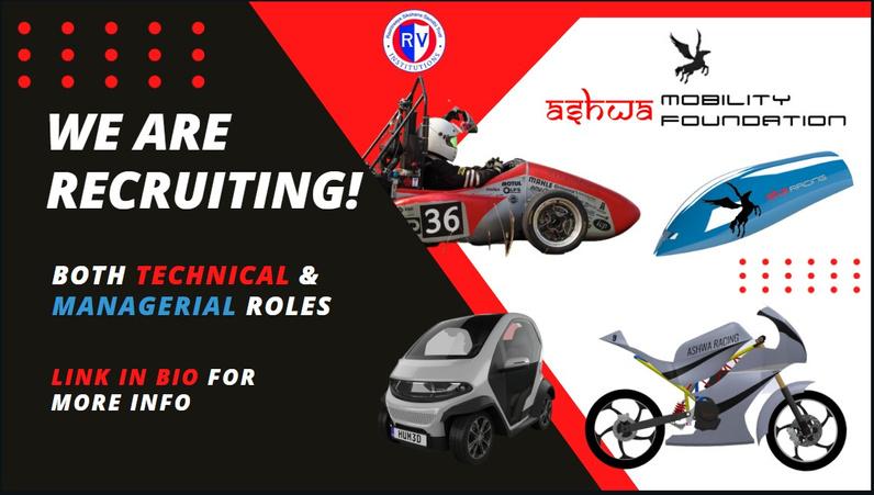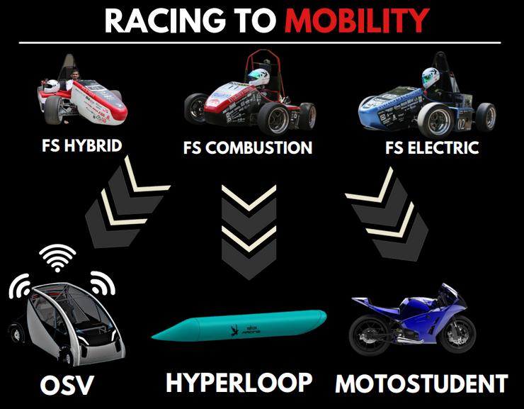 AshwaMobility'sconsistentinnovationinsustainablemobilitytothelast mile in domain of urban, rural and mass rapid transit, powers it racing division Ashwa Racing to participate in all 3 Powertrain Combustion, Hybrid and Electric eventually leading to Hydrogen Energy based mobility. Ashwa Racing competes in Formula Student Series Competitions for Single seater Race cars, Open-Source Vehicle in Electric Driver and driverless system, Motostudent representing twowheelersegmentandHyperlooppodracingrepresentingLandMobility andnotlimitedtoAir,Sea,andSpaceinthecomingyears.