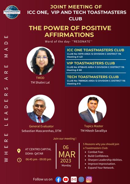 I'm truly proud to present THE ECHO- ICC One Toastmaster Club's Newsletter March 2023 issue. As VPPR, I had an amazing learning experience: responsibilities,hurdlesandjoys.Ihavedevelopedmultipleskills. Special thanks to Chief Editor- TM Anthony Mascarenhas for his immense support.