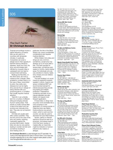 The Ouch Factor Dr Christoph Bendick Tropical surroundings involve a higher frequency of insects than we are used to in countries with temperate climates. In particular, mosquitoes can pose a danger due to their capacity to transmit serious infectious diseases. Apart from that, the itchy, red and irritated skin inflicted by mosquito bites is unpleasant and can lead to compromised well-being. Bedbug and flea bites, on the other hand, are more a nuisance than a danger. Often acquired in unclean beds or, in the case of fleas, transmitted by pets, they rarely carry diseases but can be highly itchy and are thus in danger of being infected with pusproducing germs, a condition that usually requires medical attention. ‘Sand-fly’ is an umbrella term for a number of different biting and stinging animals found in sandy areas. Their activity is mostly noticed after a stay at the beach and can produce red, intensely itchy, skin. They also do not transmit diseases. Ant bites are usually seen after outdoor activities. They are itchy and in the case of fire ants very painful, requiring medication against the ensuing inflammation. Spider bites can also be very painful, leading to swollen red skin and sometimes resulting in slow-healing scars. In