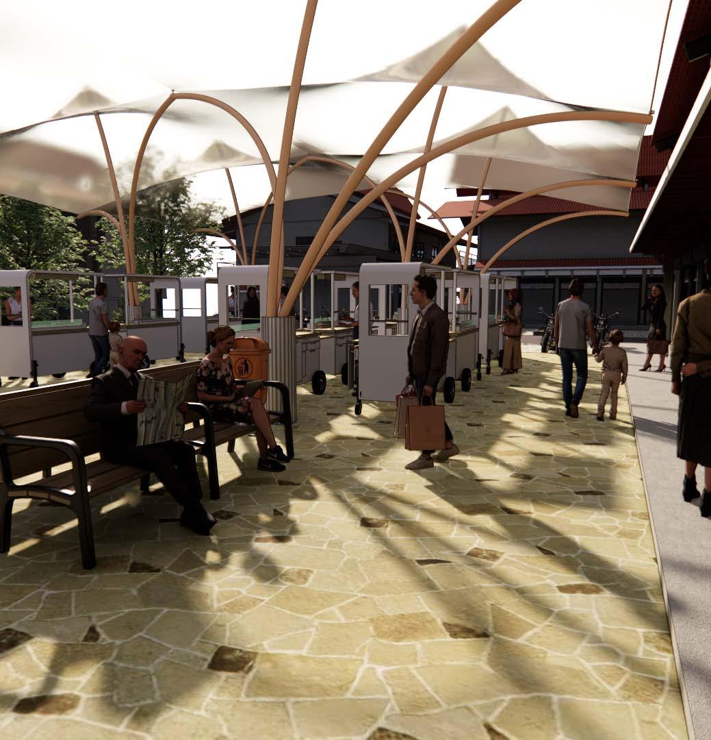 A. Administrator Office, Storage area B. No-food retail and foodcourt area C. Wet-food market area D. Dry-food market area, fast food area E. Dry-food market area F. Temporary Shelter Site Borders Building Borders Exisiting