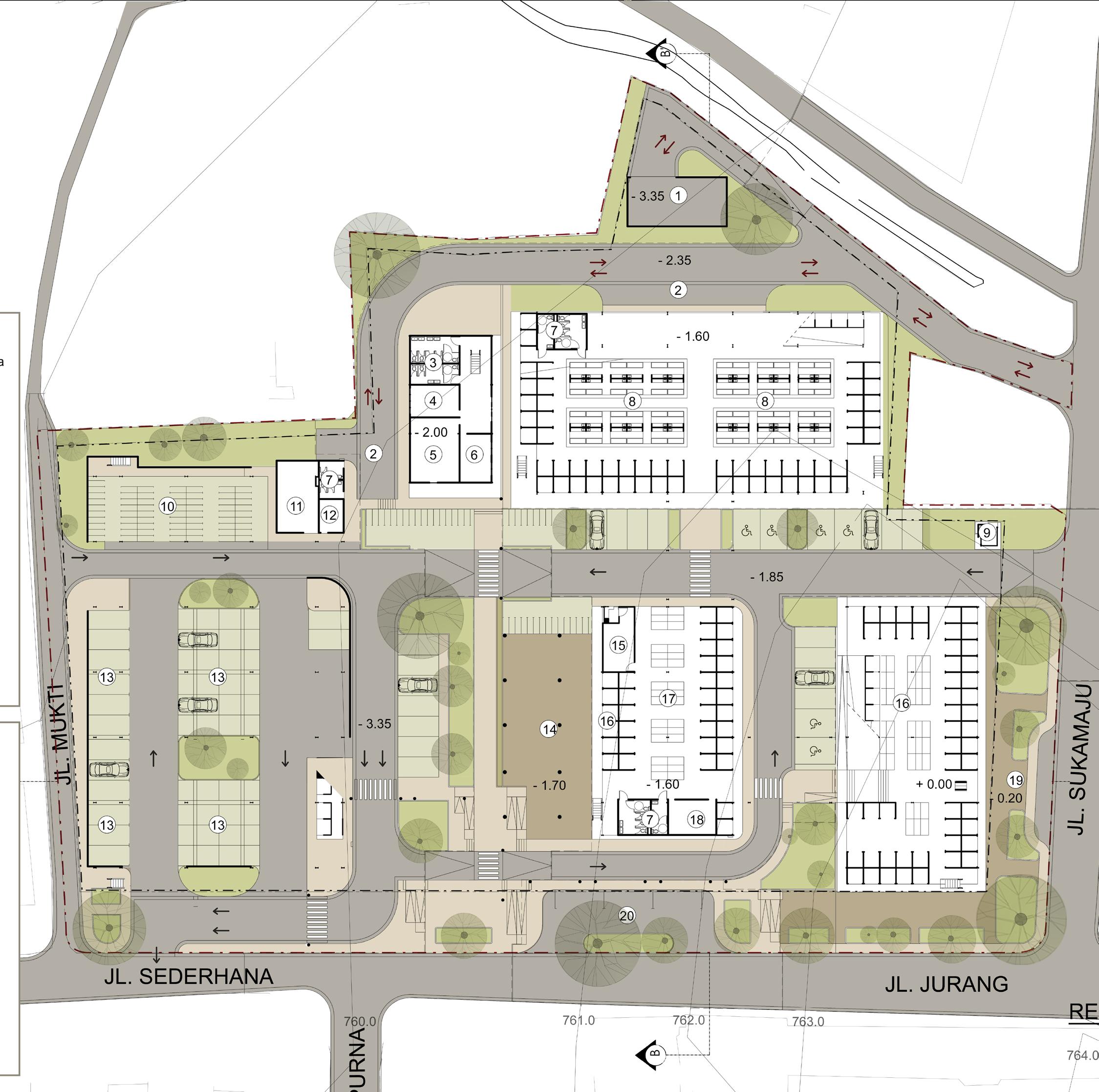Academic Works | 22 Asia Luthfiah LEGEND 1. Temporary Dump Shelter 2. Loading Dock 3. Administrator Restroom 4. Saving and Loan Cooperative 5. Storage Area 6. Clinic 7. Public Toilet 8. Wet-food Area 9. Security 10. Motocycle Parking 11. Genset Area 12. Panel Room 13. Car Parking 14. Temporary Plaza 15. Ready-Served Food Area 16. Digital Trade Area 17. Dry-Food Area 18. Prayer Room 19. Drop-off Area 20. Public Transportation Terminal