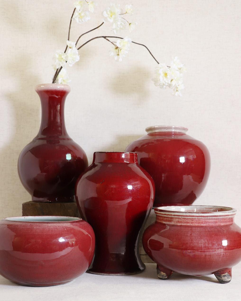 The collection, including three vases, a censer and a brush washer, is all applied with a thick glaze of rich oxblood-red colour thinning to white at the rim, which is characteristic for such type of wares.