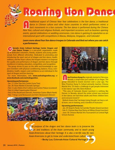 olorado Asian Cultural Heritage Center Dragon and Lion Dance Troupe is a non-profit organization made up of dedicated volunteers, friends, students and young professionals from different ethnicities. Dedicated to promoting and introducing the sport and art of dragon and lion dance, health, wellness, and the Asian culture, the troupe’s mission is to improve the quality and performance of dragon and lion dance through excellence in training, education, competition, and recognition. The group strives to pass on the skills and knowledge to support members with physical conditioning, balance, focus, coordination, health, respect, and confidence as an individual in the sport of dragon and lion dancing. For more information, visit: www.cachcdragonlion.org or www.facebook.com/cachcdragonlion. Upcoming performances: • Jan. 17: Lone Tree Arts Center (Lone Tree) • Jan. 30: Asian Market (Colorado Springs) • Feb. 5: Lulu’s Bistro (Fort Collins) and Canton Palace (Loveland) • Feb. 6: A-Mart Supermarket (Denver) • Feb. 6: Pho Boulevard (Denver), Ameristar Casino (Black Hawk) • Feb. 7: Kings Land Restaurant and Viet’s Restaurant (Denver)