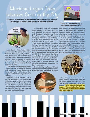 Listen to Crow in the City at loganchan.bandcamp.com cians, and plays drum kit, tambourine, and shaker. Nicholas Killeen, who, like Kahn is also a CU Boulder Jazz Studies graduate who plays in various Denver ensembles, contributed the tenor saxophone parts. All the songs were recorded and produced by Michael Lenssen, a Denver multi-instrumentalist who has toured as a horns, keys, and electronic wind instrument player. In 2021, Lenssen was credited with programming effects on Maria Schneider’s Grammy award-winning album “Data Lords.” He also contributed keys, trumpet, cornet, and flugelhorn. Michael Lenssen