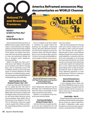 America ReFramed announces May documentaries on WORLD Channel National TV and Streaming Premieres: NAILED IT by Adele Free Pham, May 7 CIRCLE UP by Julie Mallozzi, May 14 America ReFramed’s May premieres on WORLD Channel explore radical transformation. Led by Vietnamese war refugees seeking survival for their families, Nailed It documents the the history and evolution of the fashion nail industry they dominate, while Circle Up reframes approaches to crime and punishment through the lens of restorative justice, forgiveness, and accountability. Nailed It by Adele Free Pham and C Circle Up by Julie Mallozzi will premiere on U.S. television and online on Tuesday, May 7 and 14, respectively, at 8 p.m. MT on WORLD Channel as part of the latest season of America ReFramed. The films will stream on worldchannel.org, amdoc. org and all station-branded PBS platforms including PBS.org, and on PBS apps.
