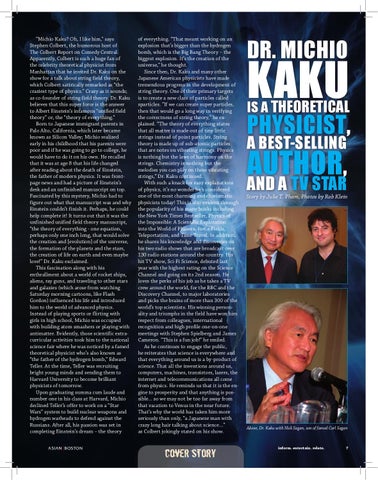 “Michio Kaku? Oh, I like him,” says Stephen Colbert, the humorous host of The Colbert Report on Comedy Central. Apparently, Colbert is such a huge fan of the celebrity theoretical physicist from Manhattan that he invited Dr. Kaku on the show for a talk about string field theory, which Colbert satirically remarked as “the craziest type of physics.” Crazy as it sounds; as co-founder of string field theory, Dr. Kaku believes that this super force is the answer to Albert Einstein’s infamous “unified field theory” or, the “theory of everything.” Born to Japanese immigrant parents in Palo Alto, California, which later became known as Silicon Valley; Michio realized early in his childhood that his parents were poor and if he was going to go to college, he would have to do it on his own. He recalled that it was at age 8 that his life changed after reading about the death of Einstein, the father of modern physics. It was frontpage news and had a picture of Einstein’s desk and an unfinished manuscript on top. Fascinated by this mystery, Michio had to figure out what that manuscript was and why Einstein couldn’t finish it. Perhaps, he could help complete it! It turns out that it was the unfinished unified field theory manuscript, “the theory of everything - one equation, perhaps only one inch long, that would solve the creation and [evolution] of the universe, the formation of the planets and the stars, the creation of life on earth and even maybe love!” Dr. Kaku exclaimed. This fascination along with his enthrallment about a world of rocket ships, aliens, ray guns, and traveling to other stars and galaxies (which arose from watching Saturday morning cartoons, like Flash Gordon) influenced his life and introduced him to the world of advanced physics. Instead of playing sports or flirting with girls in high school, Michio was occupied with building atom smashers or playing with antimatter. Evidently, those scientific extracurricular activities took him to the national science fair where he was noticed by a famed theoretical physicist who’s also known as “the father of the hydrogen bomb,” Edward Teller. At the time, Teller was recruiting bright young minds and sending them to Harvard University to become brilliant physicists of tomorrow. Upon graduating summa cum laude and number one in his class at Harvard, Michio declined Teller’s offer to work on a “Star Wars” system to build nuclear weapons and hydrogen warheads to defend against the Russians. After all, his passion was set in completing Einstein’s dream – the theory ASIAN BOSTON