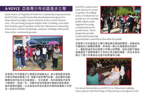 A-VOYCE youth move from theory to action as guides of walking tours of Chinatown or producers of a weekly public affairs radio segment focusing on Asian-American youth issues. These programs provide youth with leadership opportunities and interaction with the public. 亞裔青少年社區進步之聲引導成員從理論到實踐﹐培養成為 中國城步行參觀的嚮導﹐和每週一期公共電臺節目的製作 人﹐重點評論亞美社區青少年關心的問題。這些活動不僅給 成員提供了鍛煉領導才干並和公眾互動的機會﹐而且本身也 展示了青少年聲音在社區中的影響和力量。
