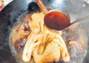 8. 在焖的过程中,我们也要经常翻动鸭身,但这里 也有一个非常重要的环节(吊水),就是在给鸭 子翻身的时候要把鸭子肚子里的酱汁先吊干再翻 身焖,这样焖出来的鸭子连骨头都是又浓又醇的 陈皮和酱香味道。