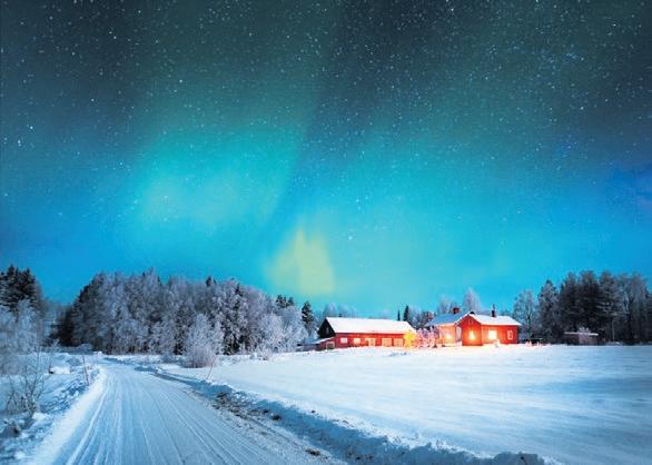 芬兰除了是圣诞老公公的家乡,也是观赏极 光的好去处,在适当的条件下,旅人几乎可以在芬 兰的任何地方欣赏到极光,而且在极光季节期间, 芬兰的拉普兰区甚至每晚都可以看到极光,光是这 个特点就让人想立刻直奔。这裡也推荐入住欧若拉 圣诞酒店Santa's Hotel Aurora & Igloos,在其著名 的玻璃穹顶客房内即可仰望星空,酒店还贴心设计 极光提醒,让你不会错过任何可以追极光的时刻。