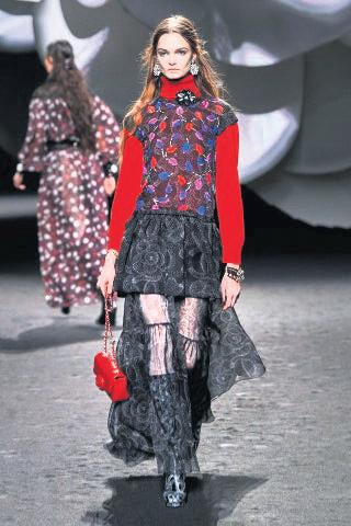“对香奈儿而言,山茶花不只 是创作主题,而是永恆经典的符 码。它给我一种安心的熟悉感, 我喜欢那种既柔软又强韧的特 质。”Viard 这麽谈到她本季的灵 感来源。大秀开场,一件皮革大 衣的翻领上装饰了山茶花,为这 柔软与坚毅间形成对比的系列, 定下了基调,这对比也在一件外 套和一套漆皮制的裙装上延续了 下来,这种皮革充满了某种 60 年 代的精神,正如 Viard 所说,这是 一种“英伦氛围”,“从褪色效 果、乾燥玫瑰色、工艺品般的创 作,60、70年代风格元素透露著 独特的英伦风情。”