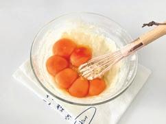 8. 取一部分蛋白霜到蛋黄糊中大致搅拌, 再倒入蛋白霜中拌匀 拌至无蛋白霜。