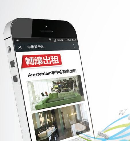 凡是在華僑新天地報紙刊登分類廣告 (招聘/轉讓/出租),只需加付10歐元, 我們便可通過華僑新天地的微信平臺推 送您的廣告內容一次(內容須和報紙廣告 完全相同,)。