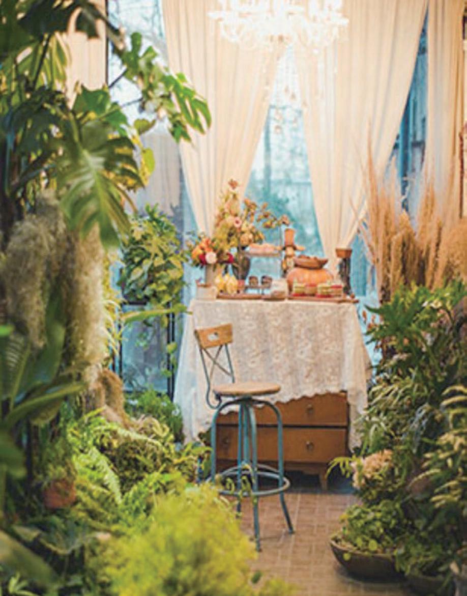 用绿植和鲜花装饰而成的房子,或许会博得很多人的青睐。鲜花从入门一路延伸 到室内,进门探访,所有的家具都仿佛深埋在丛生的花叶之中,鲜花干花错落,冷不 丁摩挲你的衣裳。可以依着家的模样打造一处鲜花满布的复古空间,有客厅有厨房。 你可以在这里读书休憩,烘焙轻食——眼睛所及,生机勃勃,爱意满满。