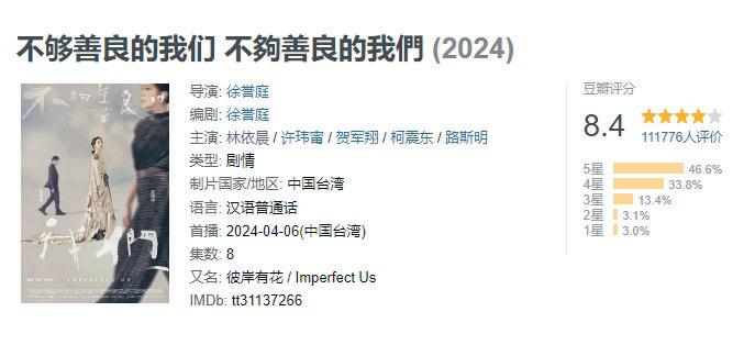 《不够善良的我们》这部戏剧在近期受到了广泛关注,原因 不仅在于其扣人心弦的剧情,还在于它触及了许多深层的情感和社 会问题。这部由林依晨和许玮甯领衔主演的双女主剧,在豆瓣开分 为8.5,并在播出后迅速上升至8.8,最终达到了9.0的高分,成为 今年华语剧的口碑冠军。