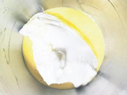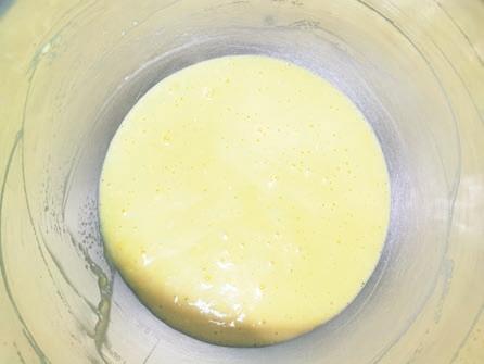 步骤1:蛋清蛋黄分离,盛蛋白的碗需要无 油无水。蛋黄中加入牛奶、玉米油,蛋 黄打发到体积膨大,状态浓稠,颜色变 浅,即乳化状态。