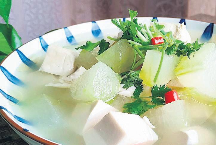 功效:冬瓜性寒,能清降胃火,养胃生津,使人食量减少,促使体内淀汾、糖转化为热能, 而不变成脂肪。同时冬瓜有抗衰老的作用,久食可保持皮肤洁白如玉,润泽光滑,并可保持 形体健美。最重要的,冬瓜还有良好的清热解暑功效。猪排骨除含蛋白、脂肪、维生素外, 还含有大量磷酸钙、骨胶原、骨粘蛋白等,可为幼儿和老人提供钙质。两小块豆腐,即可满 足一个人一天钙的需求量。