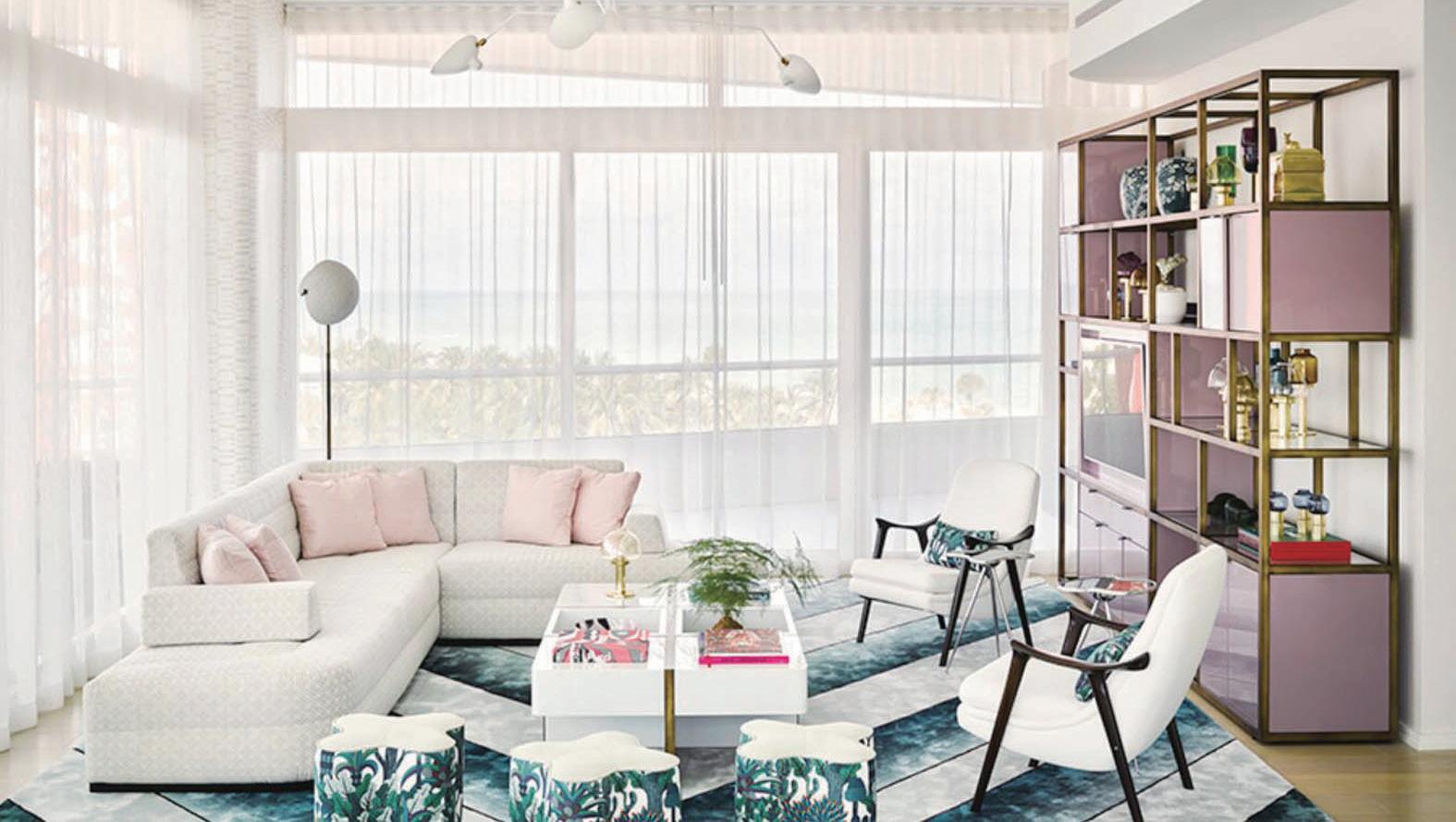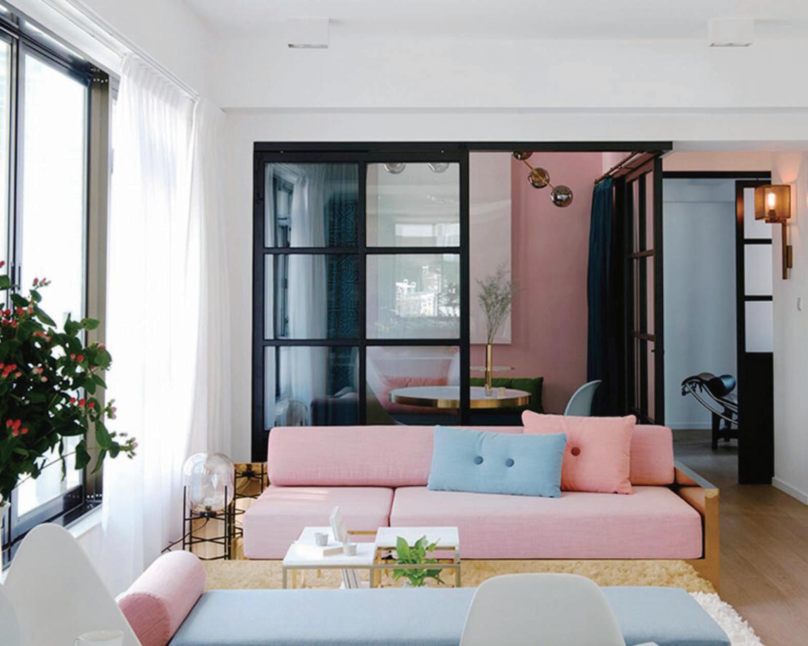 贵妃椅既能坐又能躺。粉脂色的贵妃椅巧妙地将客 厅分为主次两个区域,在保持通透感的同时,还可以让 人随时倚靠,甚至可以在这里打个盹儿,来了客人还能 作为临时睡床。