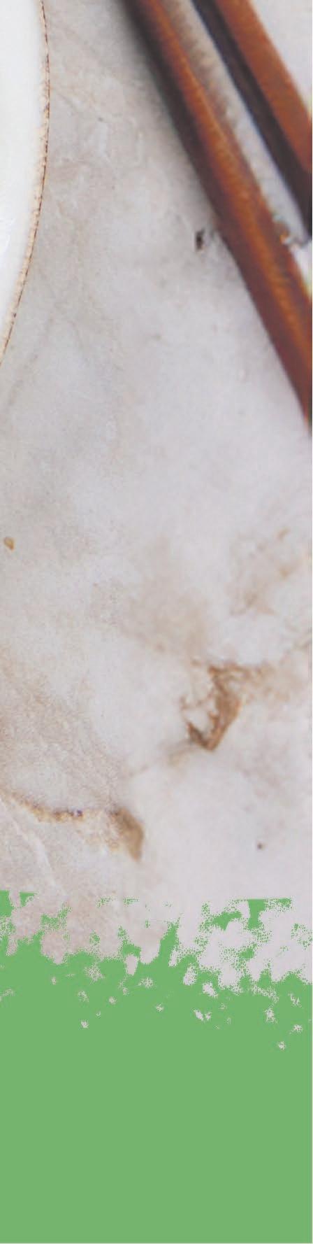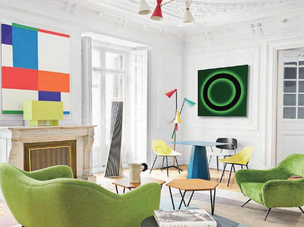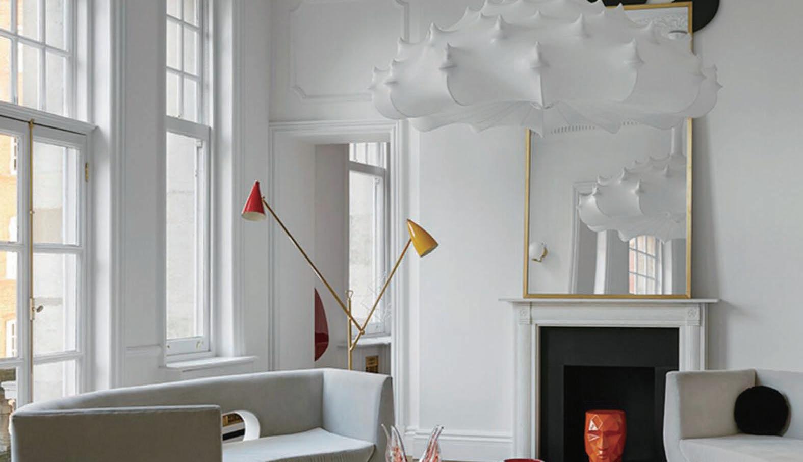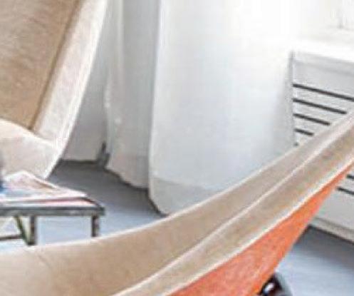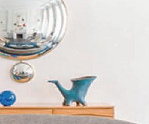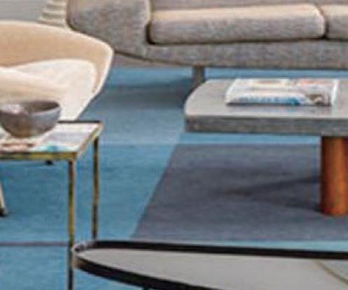 多种材质组合。想要创造一个有趣且独特的房间, 需要把各种复古和流行的元素混搭起来。长沙发细腻 的天鹅绒面料、单椅厚实的皮革,以及灯具的金属质地, 比例感和分寸感运用得恰到好处。
