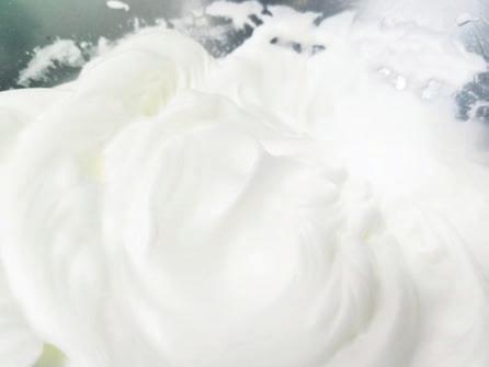 步骤4:将打蛋器洗净并擦干后,开始打发 蛋白。期间分三次加入白糖,最终将蛋 白打发到湿性发泡的状态(提起打蛋器 后,蛋白拉出弯曲的尖角)。