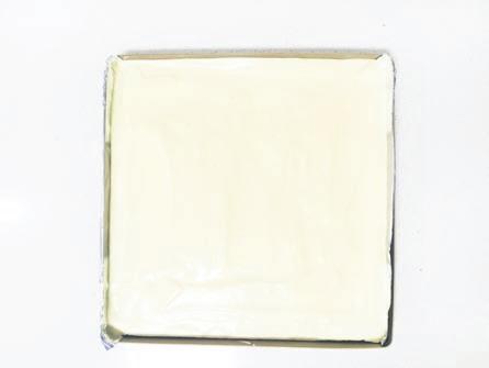 步骤7:烤盘铺好锡纸,倒入面糊抹平, 并用力震几下,让面糊内部的大气泡跑 出。