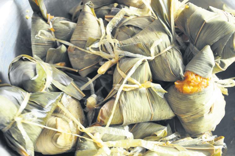 En dan is er Zongzi — pakketjes van kleefrijst, omwikkeld met bamboebladeren. Die bladeren geven een bijzondere geur af aan de rijst. Zongzi maken en eten we tijdens het Drakenbootfestival. Het is een lekkernij die ik van mijn oma heb leren maken. Mijn favoriet zijn de zoete Zongzi, met een vulling van Chinese dadel. De natuurlijke zoetheid van de dadels komt vrij als ze eenmaal zacht zijn gestoomd.