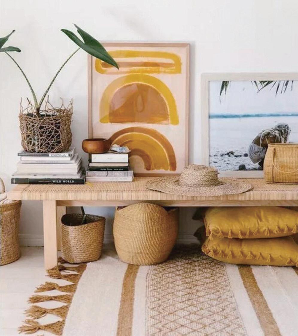 ▲适合搭配原木色的还有棕黄色。二者的差别在于材质 的不同以及色相上的细小变化。加入棕黄色的原木空间可以 营造出异域风情,另外编织筐和印花地毯是值得入手的好物。